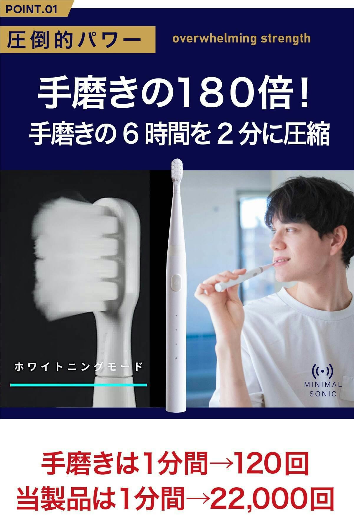 手磨きは1分間で120回磨けるのに対して、ミニマルソニックは1分間で22,000回磨けます。これだけパワフルな力を秘めたホワイトニングモードを搭載しています!