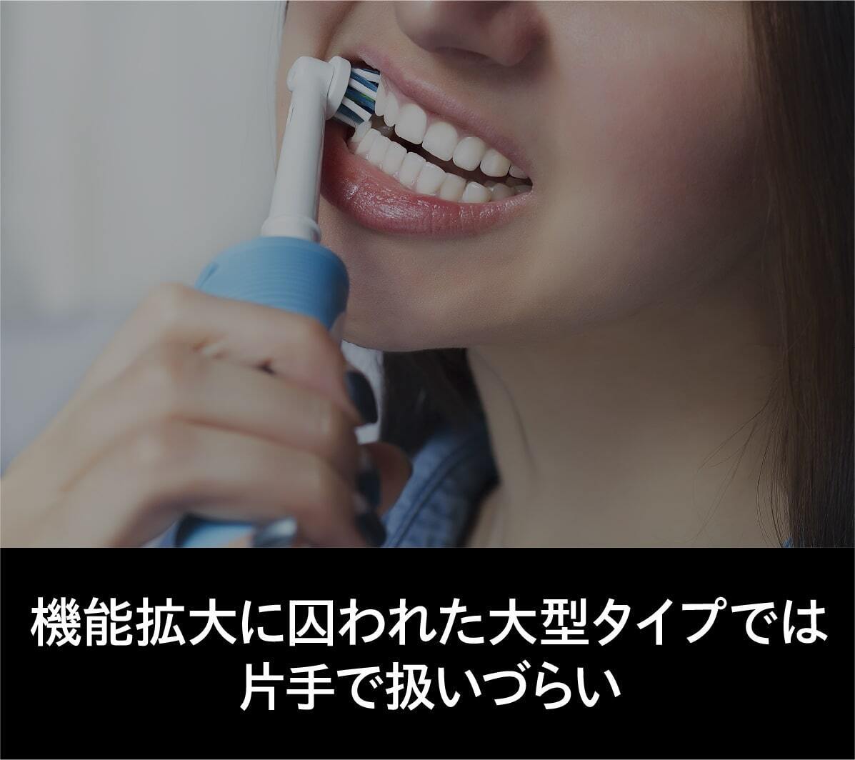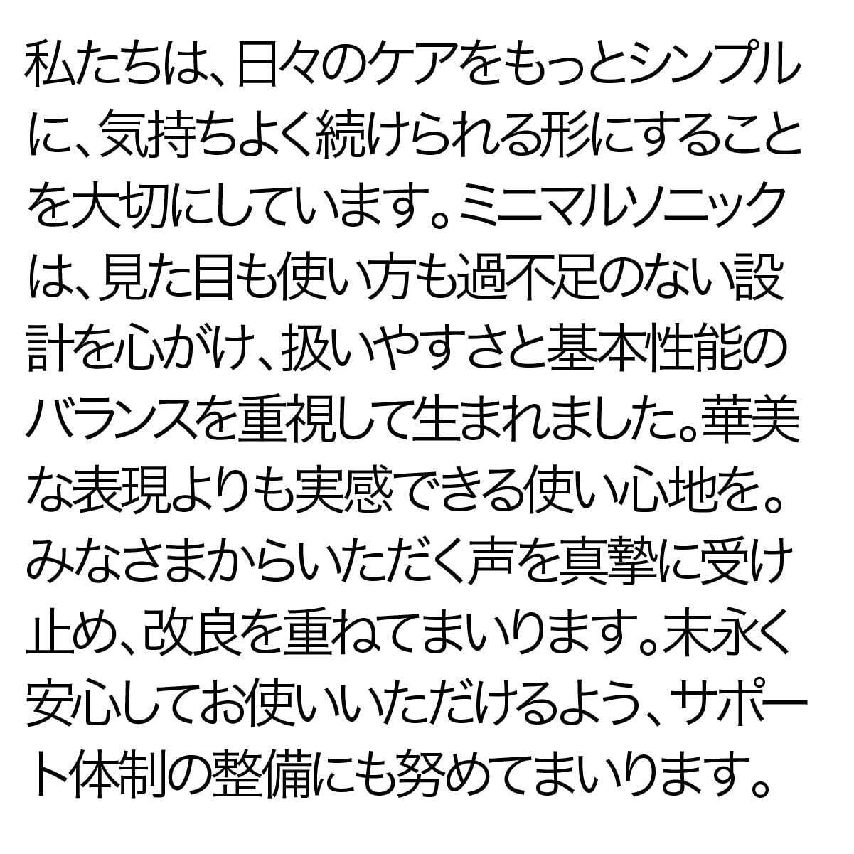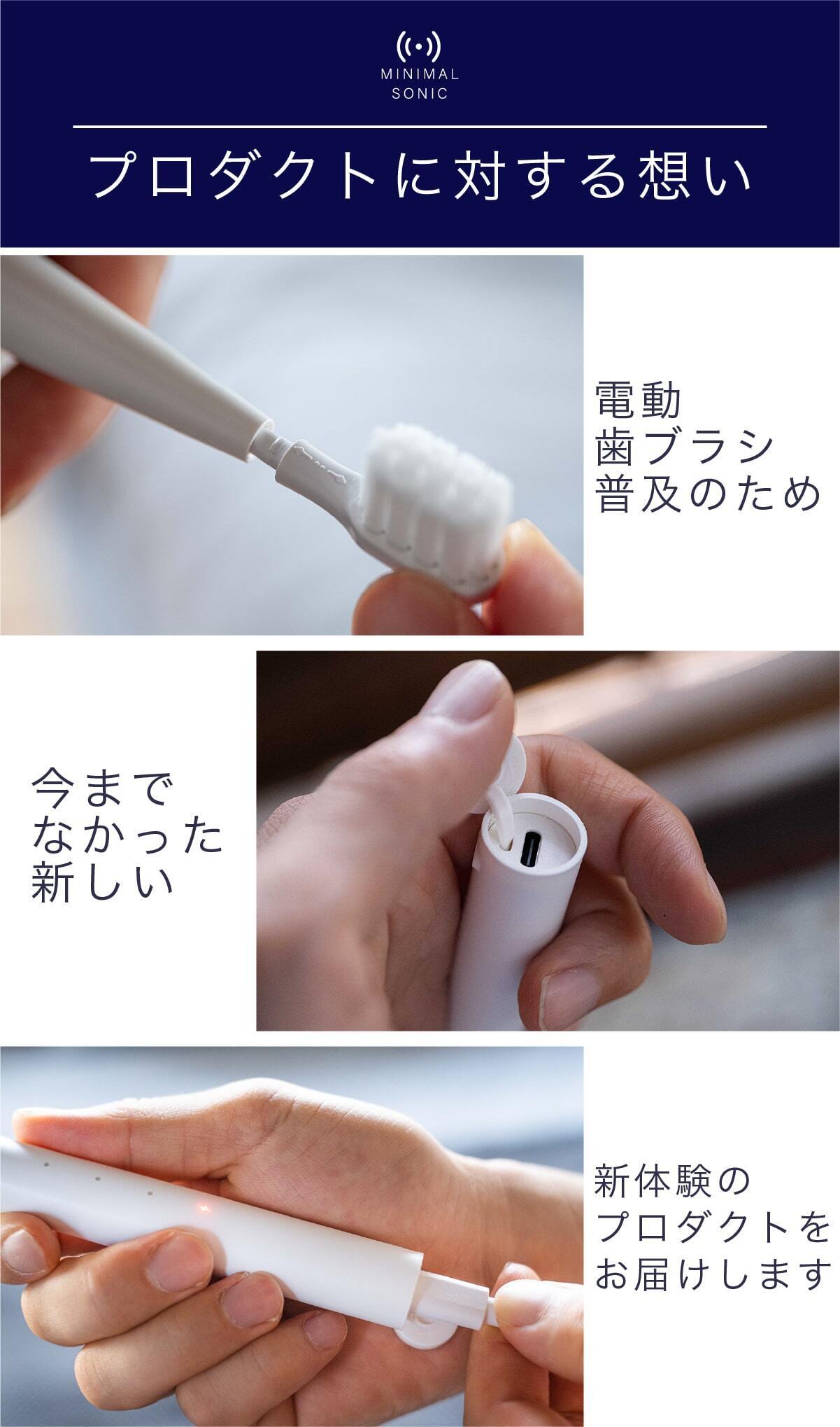 今までの電動歯ブラシを大きいと感じたことはありませんか?普通の歯ブラシから電動歯ブラシに変えた時にそれを大きく感じると思います。電動歯ブラシは構造上、大型化してしまうのですが、常識に囚われずまったく新しい電動歯ブラシを設計したのがこのミニマルソニックです。新発想の構造で小型でパワフル。未来の体験をはじめましょう。