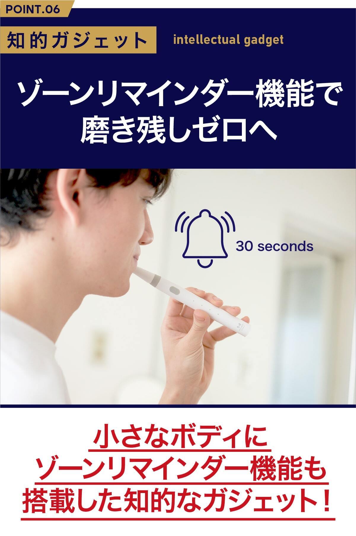 ゾーンリマインダー機能であなたが30秒磨く毎にバイブレーション通知が。上下と表裏の4箇所をしっかり磨くことができます。