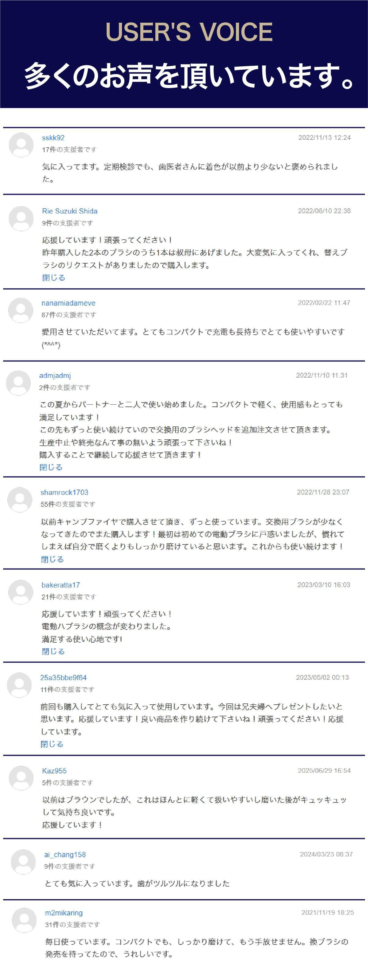 2026/02/14 20:00日頃より、多くのご支援ありがとうございます。「替えブラシ」のリターンを販売しておりますので、ご案内させて頂きます。<こちらで開催中>https://camp-fire.jp/projects/914025/view(※ミニマルソニック2本目のご購入もオススメです。)この機会に是非、ご利用下さいませ。引き続き、ミニマルソニックをどうぞよろしくお願い申し上げます。ミニマルトゥースラボスタッフ一同 もっと見る【替えブラシ】リターン販売中のご案内