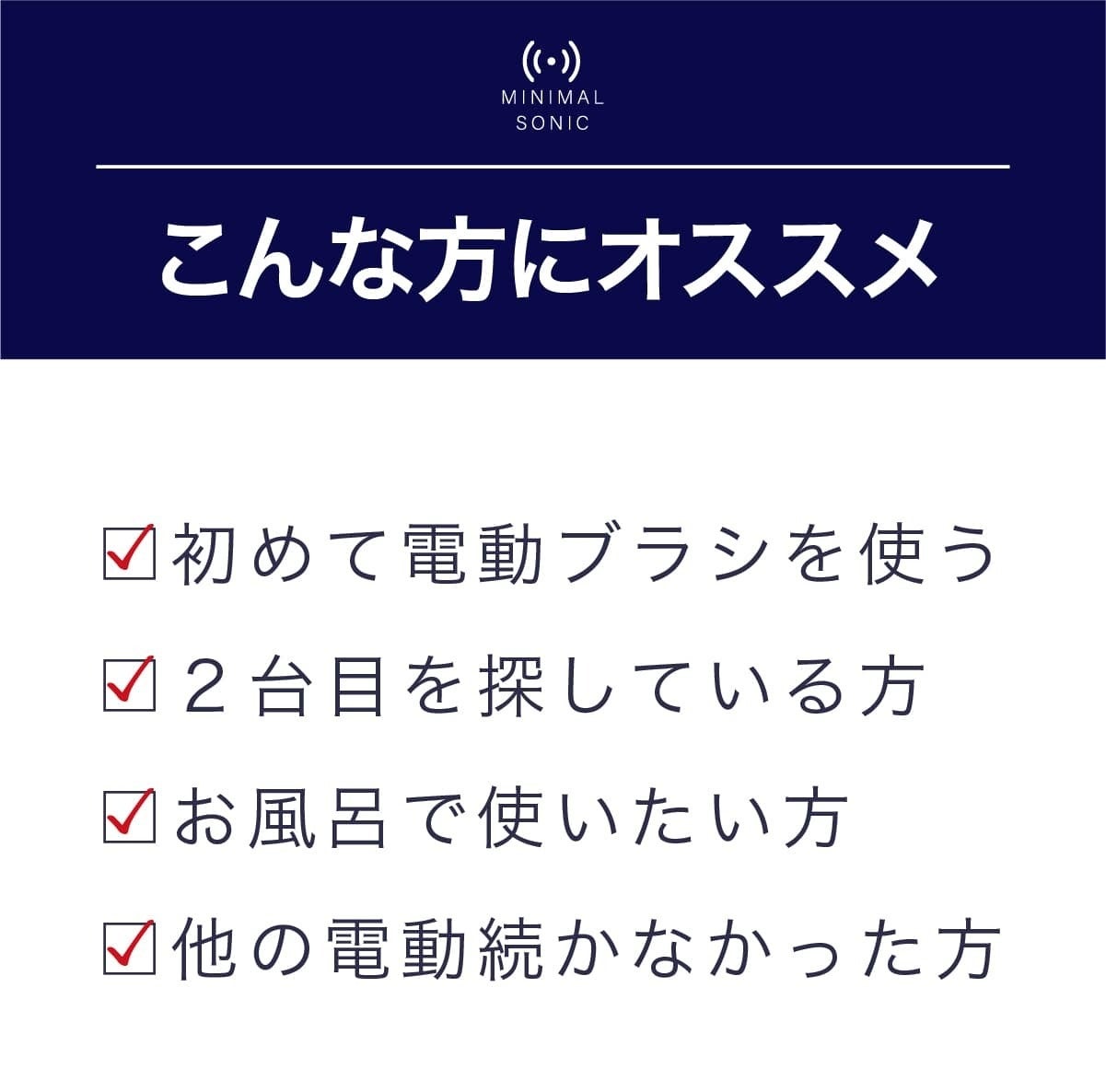 ミニマルソニックは、これまでの電動歯ブラシとは一線を画す「特許級」の新しい歯磨き体験 を提供します。実用新案登録済 の独自技術により、超音波振動が歯垢を効果的に除去しながらも、歯ぐきにやさしい洗浄を実現。手磨きや従来の電動歯ブラシでは落としきれなかった汚れを、よりスムーズに、より快適にオフ。ぜひ、この特許級のブラッシング体験 を、あなたの歯と歯ぐきで実感してください。