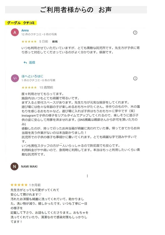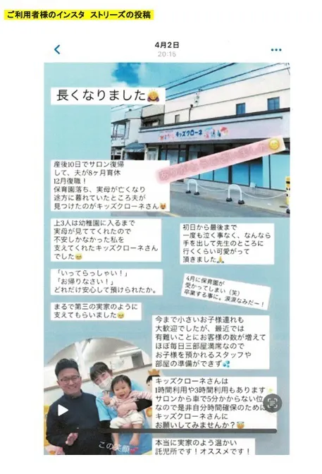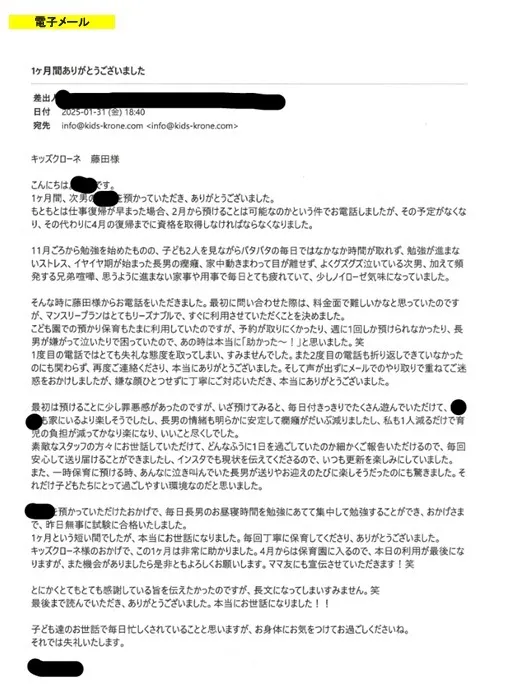 そんな中、「キッズクローネ」さんのような一時預かり専門の託児所が地域に存在していることは、本当に心強く、必要とされていると感じています。