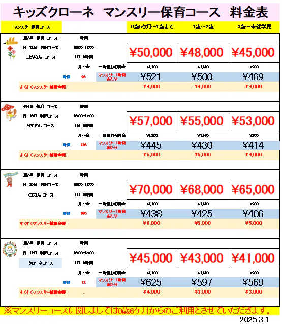 マンスリー(月極)コース料金表