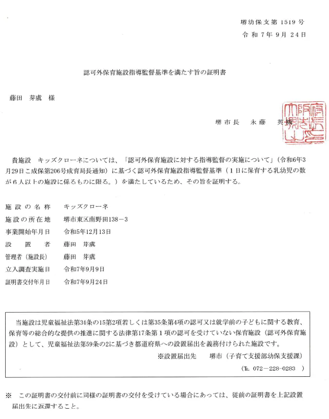 キッズクローネは「認可外保育施設」になります。認可外保育施設とは、児童福祉法に基づく都道府県知事による設置認可を受けていない保育施設の総称です。認可外保育施設であっても、市長の指導監督を受ける義務があり、児童福祉法に基づき、施設が満たすべき【認可外保育施設指導監督基準】が定められています。認可外保育施設指導監督基準を満たす旨の証明書 の取得