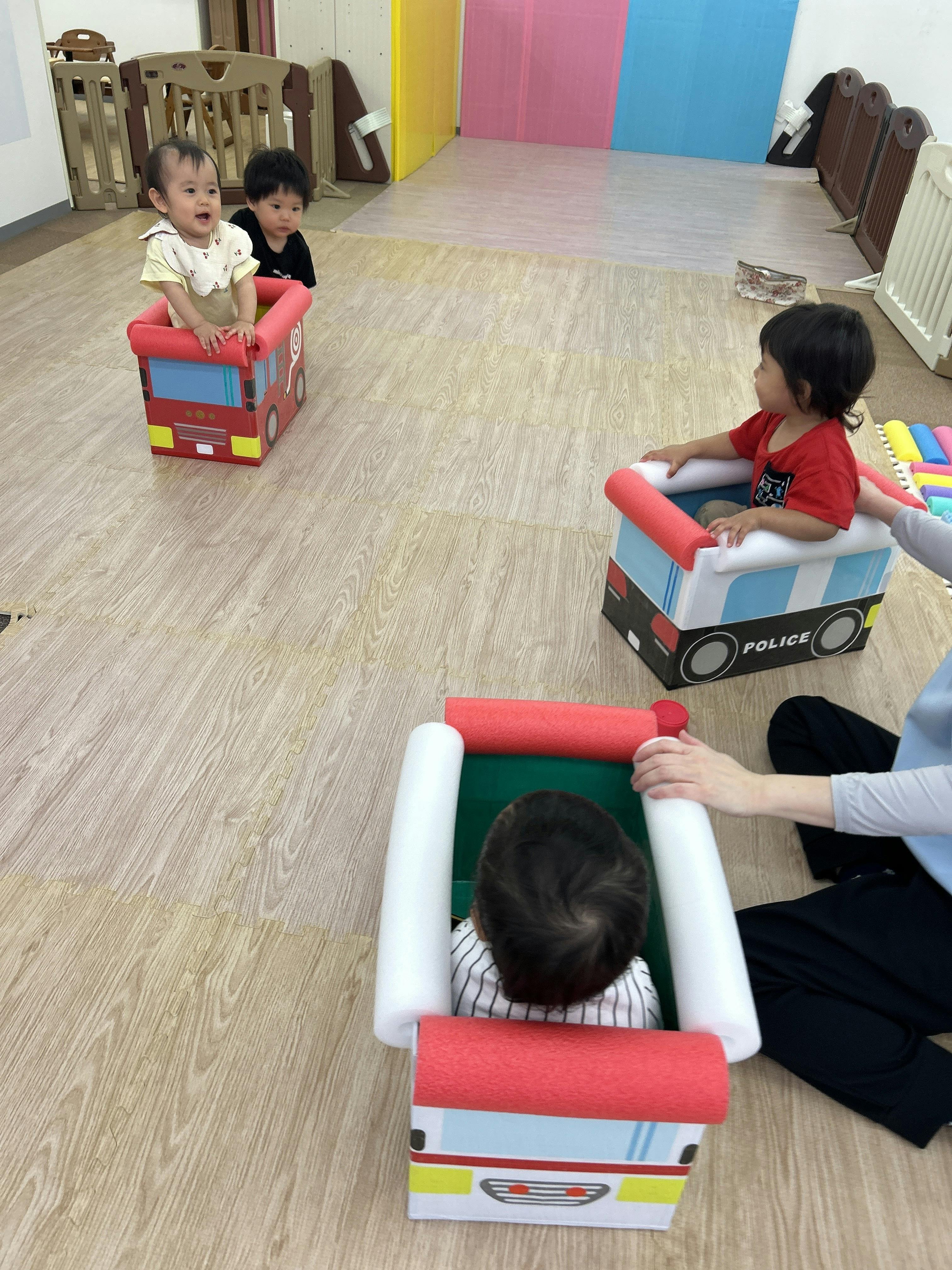 新しくダンボールで作った 救急車 パトカー 消防車 にこどもたち、みんな大喜びでした。