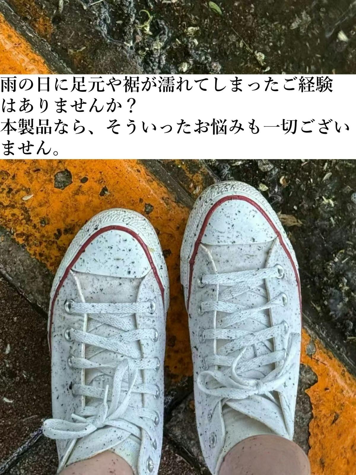 雨や雪だけでなく、足元にできた水たまりの泥はねや車からの 飛び散りなどから大切な靴やズボンの裾をしっかりガードします。
