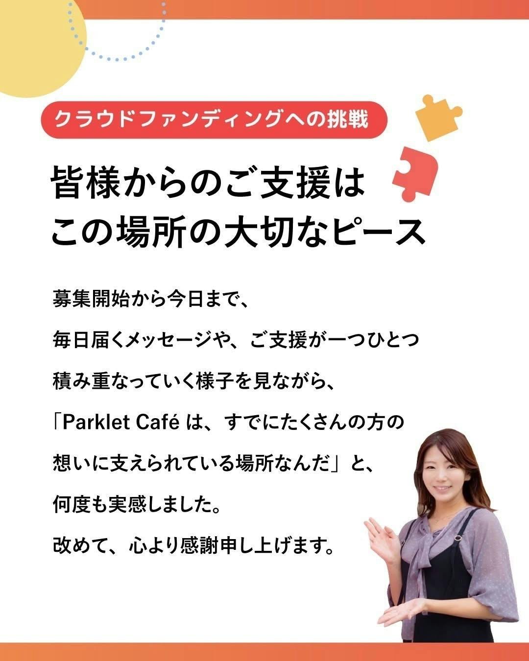 みなさんのご支援が、Parklet Café の第一歩を支え、「安心」「成長」「つながり」にあふれる場所を生み出します。どうか、この想いに共感していただき、Parklet Café のスタートを共に育て、応援してください。