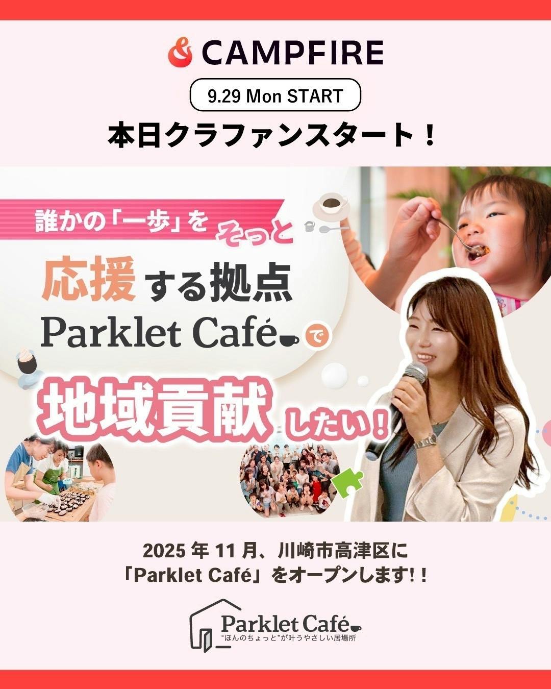 わたしたちParklet Caféの役割は、日々の育児に伴う孤独や不安を、毎日でも気軽に通える“ほっとできるカフェ”というかたちで、日常に寄り添う居場所をつくることで解決すること。ちょっとおしゃべりしたいとき、子どもと安心して過ごしたいとき、ここに来れば「大丈夫」と思える。Parklet Caféは、ママやパパの心がふっと軽くなる、日常のよりどころです。忙しい日々の中で、ほんのひと息つける“憩いの場”として、武蔵新城の街に根づいていきたいと思っています。「いいね」「シェア」も大きな応援です。ぜひこの挑戦を、あなたの大切な方にも届けていただけたらうれしいです。小さなカフェから、未来を変える一歩を。一緒にParklet Caféを育ててください。#パークレットカフェ #子育て世代の居場所#地域とつながる場所#川崎子育て #地域の居場所 #みんなでつくるカフェ