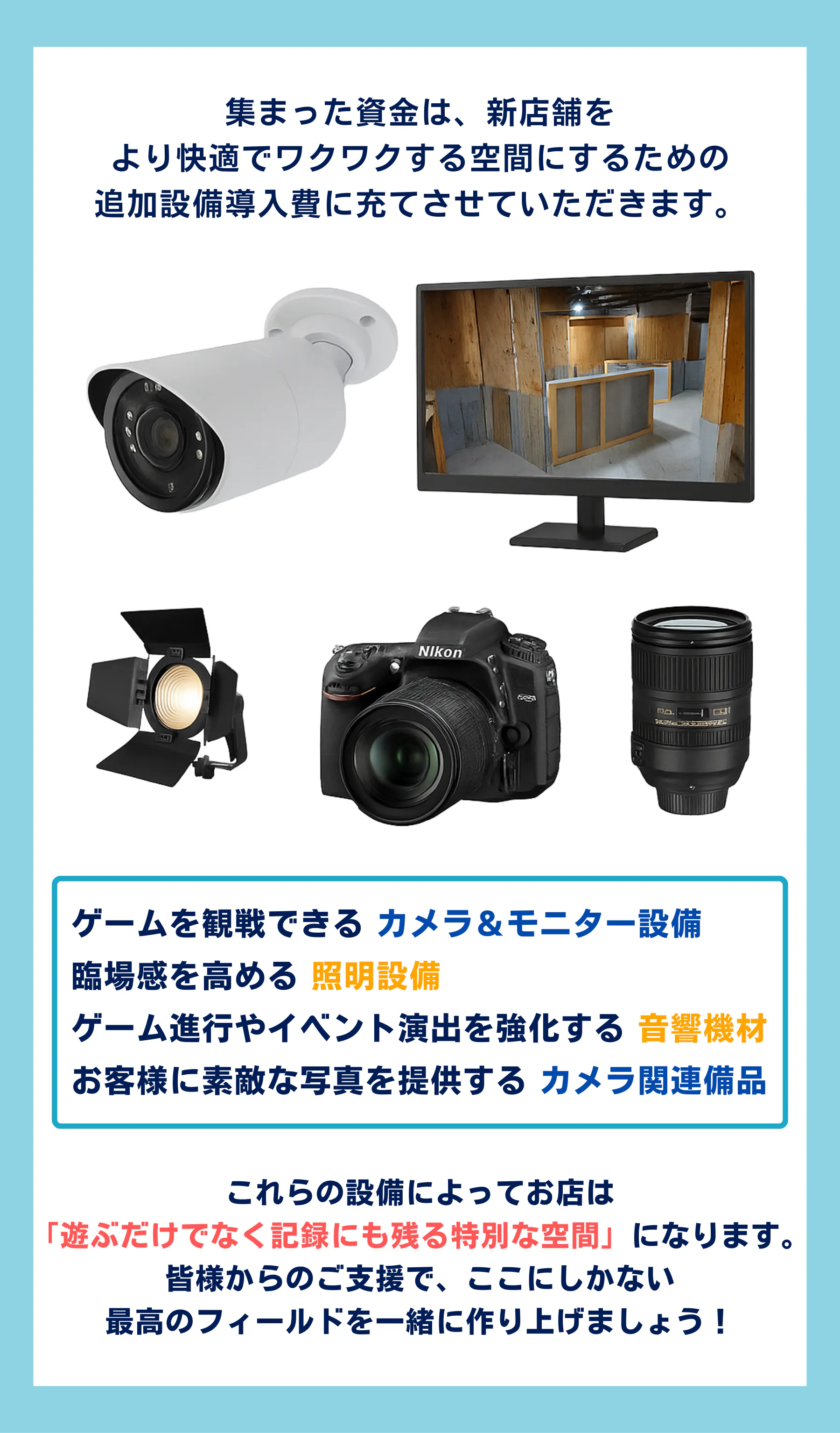 2025/11/01 14:249月から開始したクラウドファンディングは、昨日無事に終了いたしました。最終結果は総支援金額 4,007,300円/支援者数 267名。設定していたラストゴール400万円を達成することができました。終盤の大きな後押しに、スタッフ一同、驚きと感謝の気持ちでいっぱいです。心より御礼申し上げます。また、CAMPFIREにおける「サバイバルゲームフィールド」案件として、支援金額・支援者数ともに1位となりました。重ねてありがとうございます。これはゴールではなく、本厚木店オープンへ向けた新たなスタートです。リターンアイテムはこれから製作に入り、できる限り早くお届けできるよう進めます。設営・準備の進捗は今後も随時お知らせしますので、引き続き変わらぬ応援を何卒よろしくお願いいたします。 もっと見るライティングレール設置ほぼ完了/スポット点灯まで確認