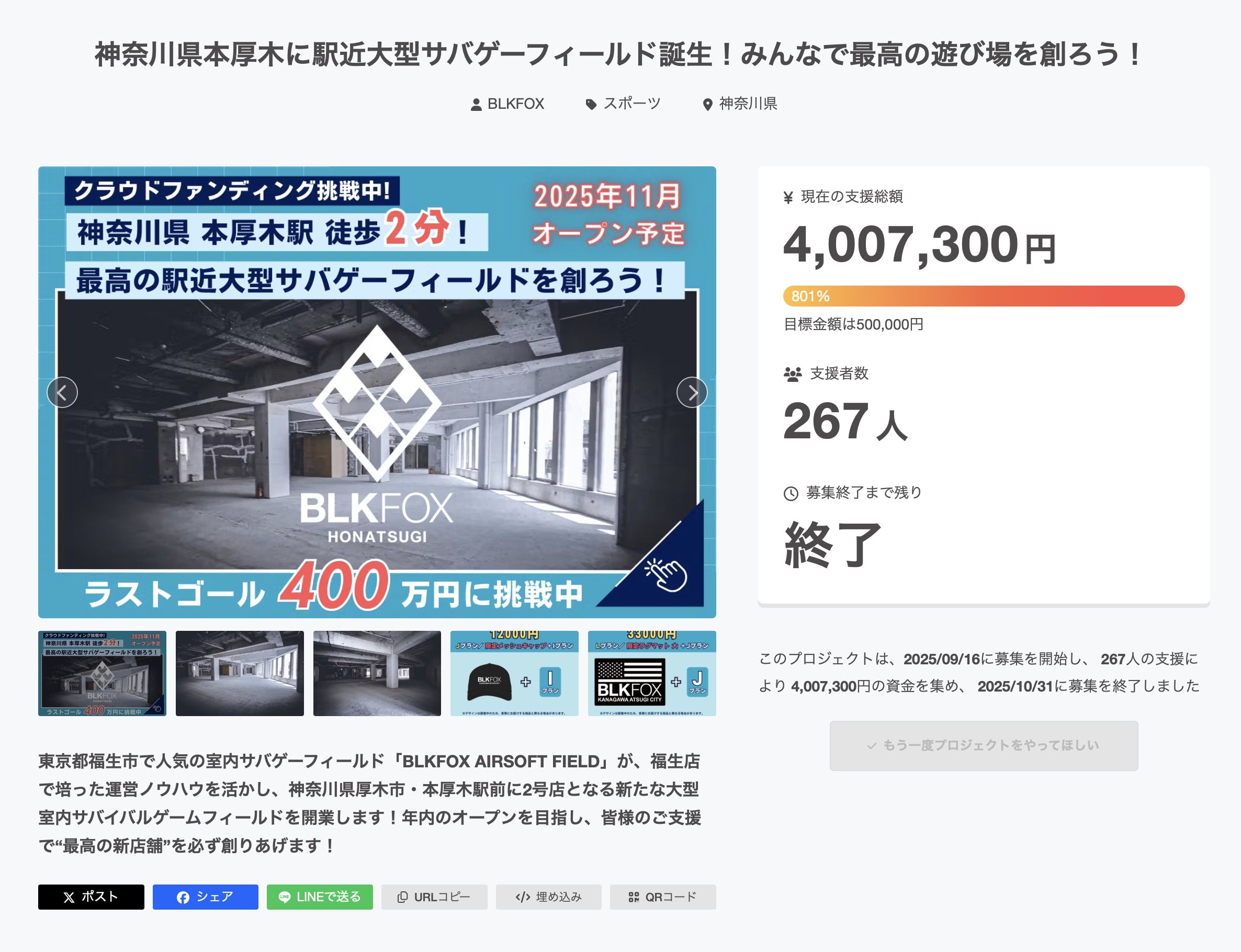 2025/11/01 14:249月から開始したクラウドファンディングは、昨日無事に終了いたしました。最終結果は総支援金額 4,007,300円/支援者数 267名。設定していたラストゴール400万円を達成することができました。終盤の大きな後押しに、スタッフ一同、驚きと感謝の気持ちでいっぱいです。心より御礼申し上げます。また、CAMPFIREにおける「サバイバルゲームフィールド」案件として、支援金額・支援者数ともに1位となりました。重ねてありがとうございます。これはゴールではなく、本厚木店オープンへ向けた新たなスタートです。リターンアイテムはこれから製作に入り、できる限り早くお届けできるよう進めます。設営・準備の進捗は今後も随時お知らせしますので、引き続き変わらぬ応援を何卒よろしくお願いいたします。 もっと見るライティングレール設置ほぼ完了/スポット点灯まで確認