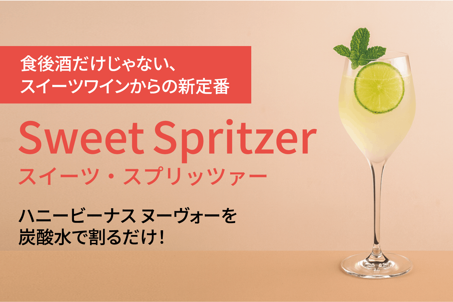 "スイーツ・スプリッツァー"の作り方はとっても簡単。氷をいれたグラスにハニービーナス ヌーヴォーを注ぎ、炭酸水で割るだけで完成です。軽やかな飲み口で、日々のお食事とも気軽に楽しめます。お好み焼きなど甘みのあるソース系料理との相性も抜群です。お好みで柑橘やハーブを加えると味わいのバリエーションがぐっと広がります。