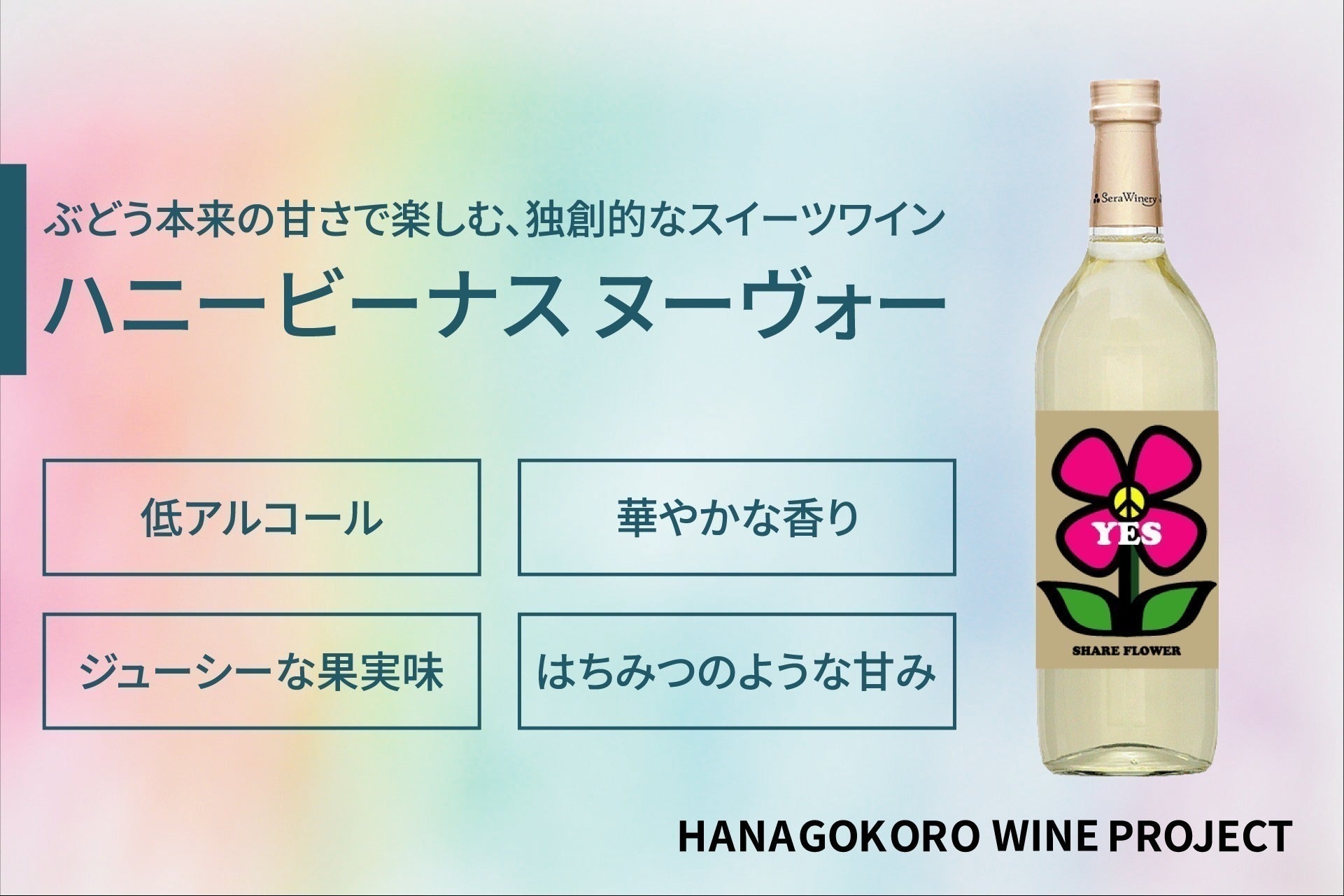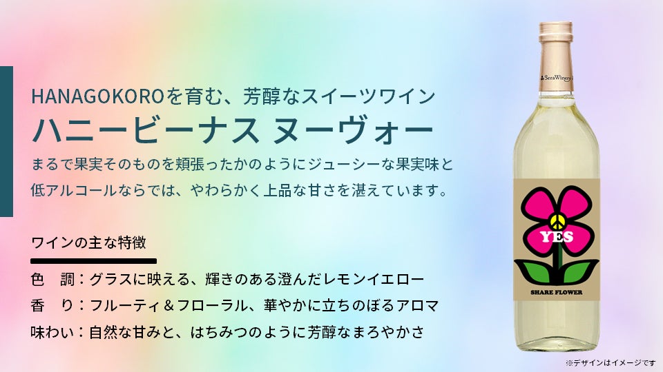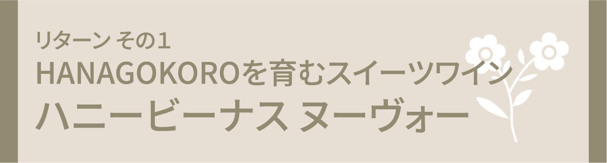 ハニービーナスから生まれるスイーツワインは、低アルコールでありながら自然な甘さと芳醇な味わいで、ワイン初心者にも優しく、まさに"HANAGOKORO"を育む特別な一杯になります。