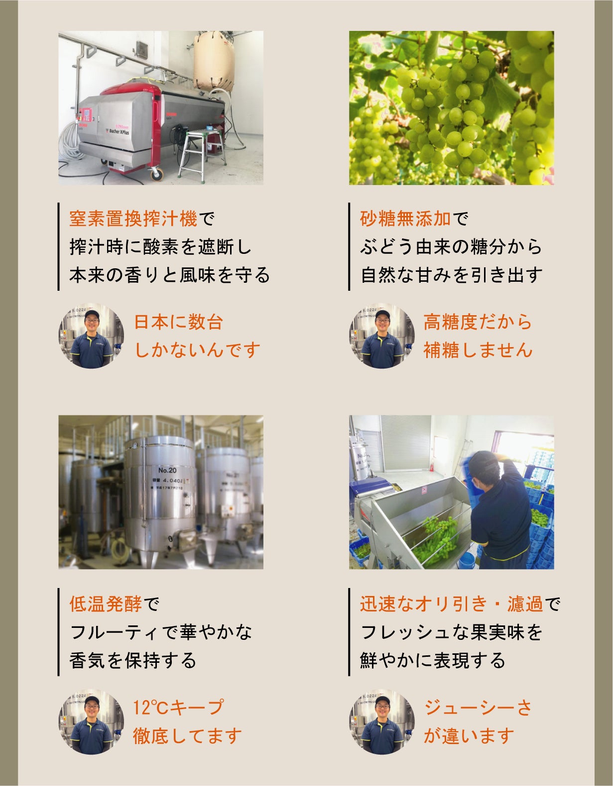 ・芳香性:マスカット系の華やかな香りが、ワインに気品と奥行きを与えます