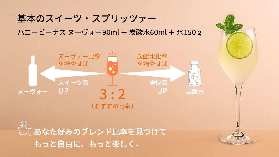 "スイーツ・スプリッツァー"の作り方はとっても簡単。氷をいれたグラスにハニービーナス ヌーヴォーを注ぎ、炭酸水で割るだけで完成です。軽やかな飲み口で、日々のお食事とも気軽に楽しめます。お好み焼きなど甘みのあるソース系料理との相性も抜群です。お好みで柑橘やハーブを加えると味わいのバリエーションがぐっと広がります。