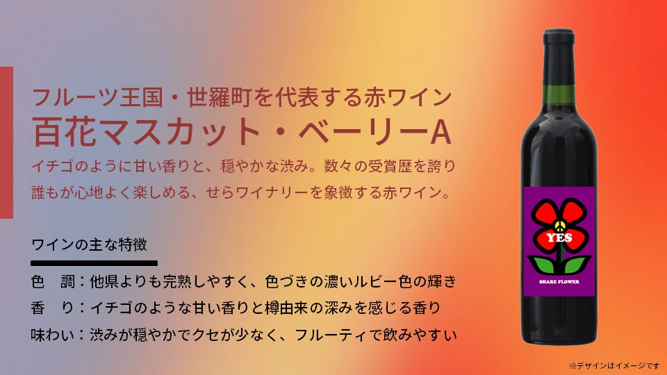 せらワイナリーを代表する赤ワイン「百花マスカット・ベーリーA」にミレイヒロキ氏のアートラベルが新たな命を吹き込みました。