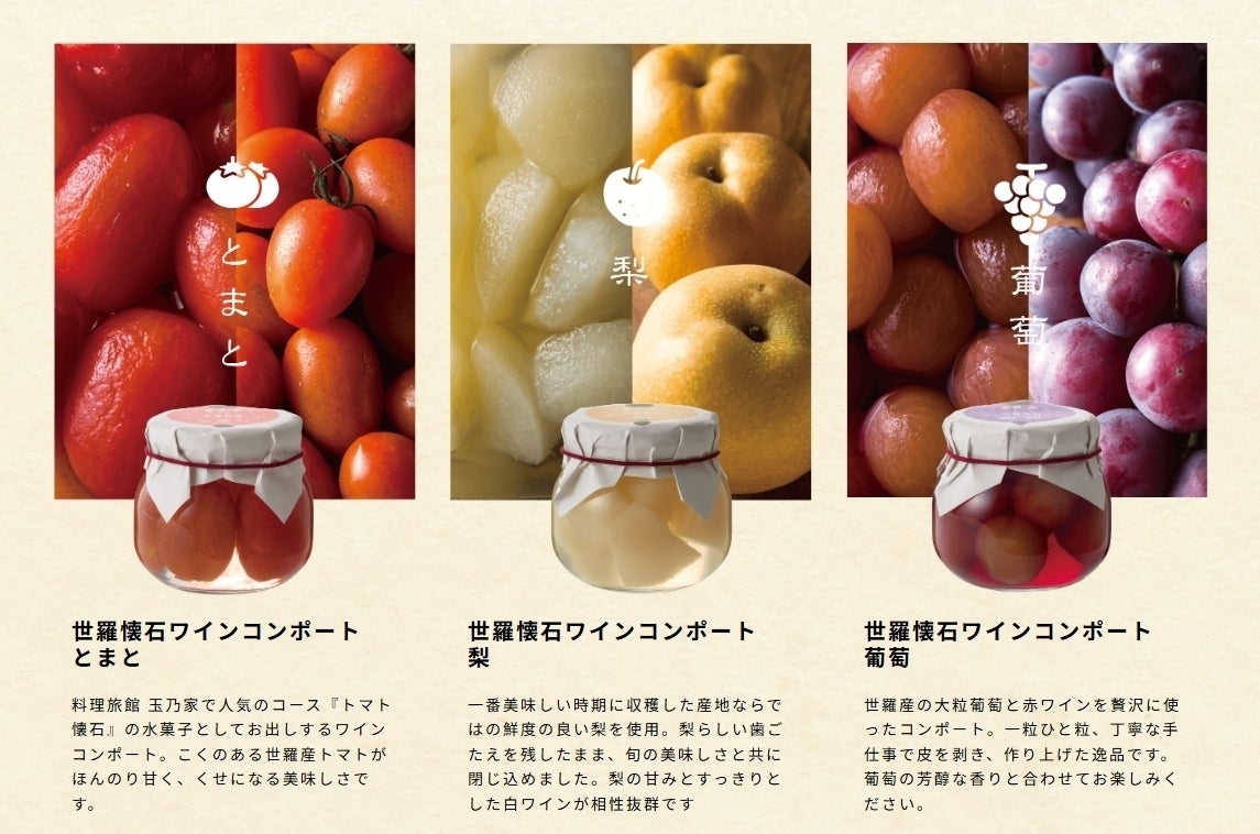 広島県世羅町の老舗料理旅館「玉乃家」が贈る、懐石デザート。使っているのは地元世羅町産のフルーツとワイン、そして少しの自然糖だけ。ワインはせらワイナリーで造られたワイン(赤・白)を使用しています。一つひとつ大切に、丁寧に、大将の手仕事で造っているコンポートだから、料理にも使えて「シロップまで全て食べきれる」フードロスの出ない環境にも人にも優しいワインコンポートです。