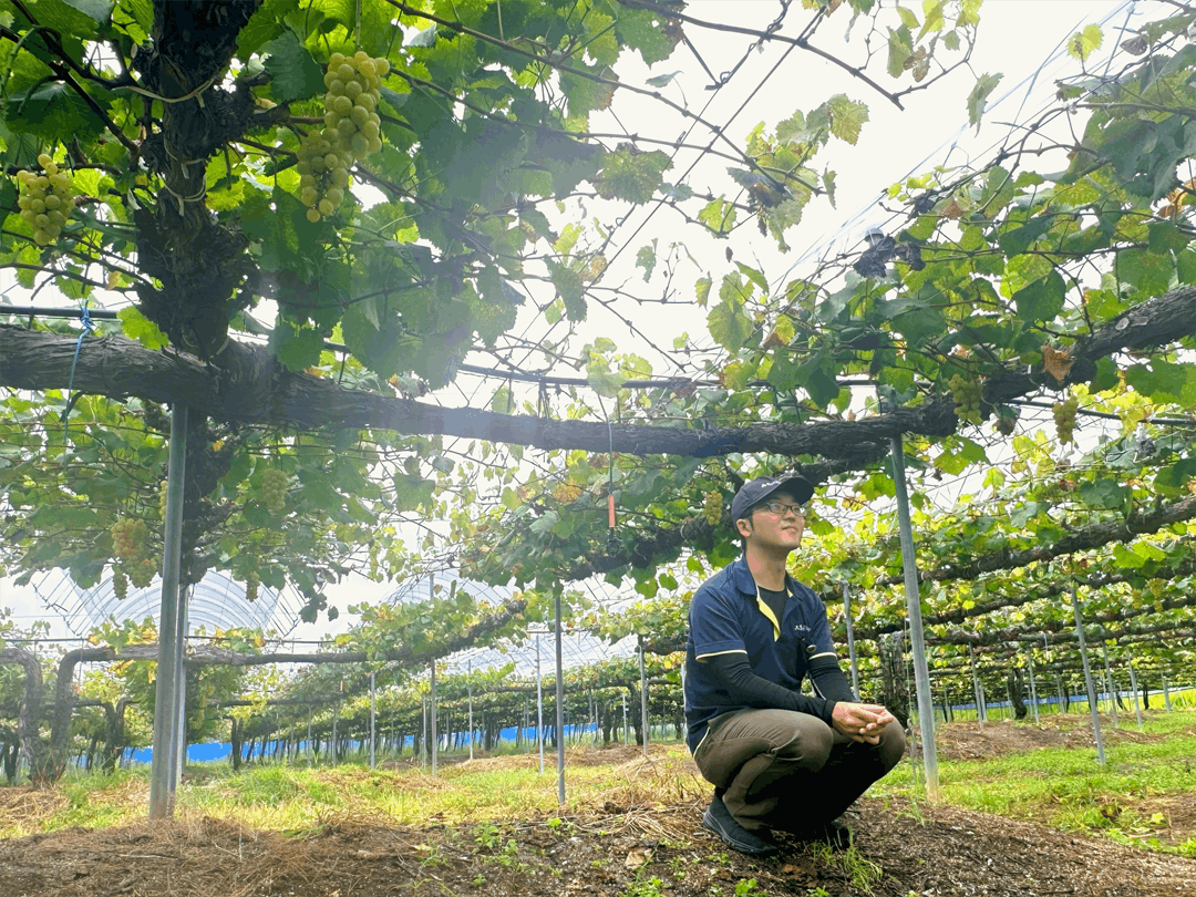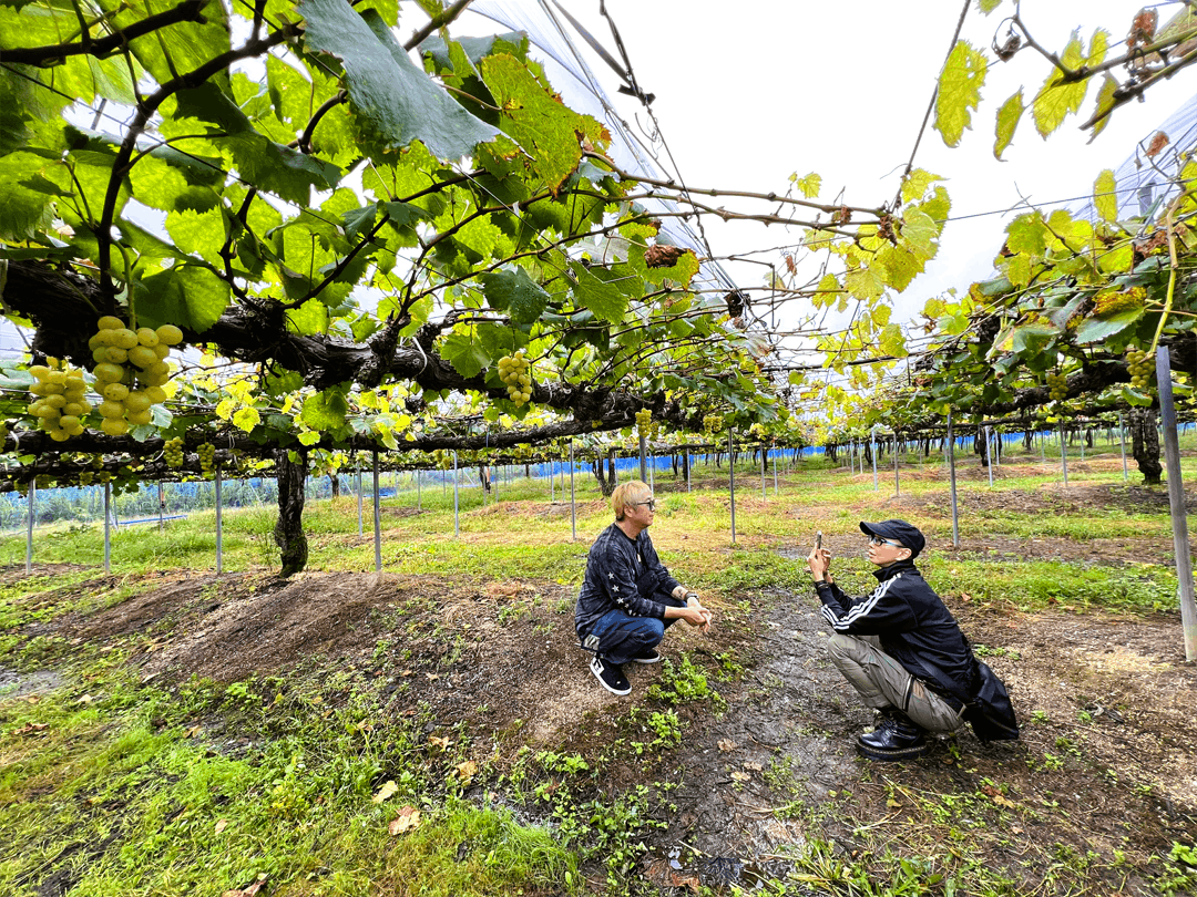 眼前に広がるぶどう畑を前に、自然の恵みを感じながら歩く姿は、まさに作品の着想を探すアーティスト。樹齢20年のハニービーナスの畑では、一粒一粒のぶどうが大切に育てられ、その背景にある生産者の情熱を間近で感じ取っていただきました。
