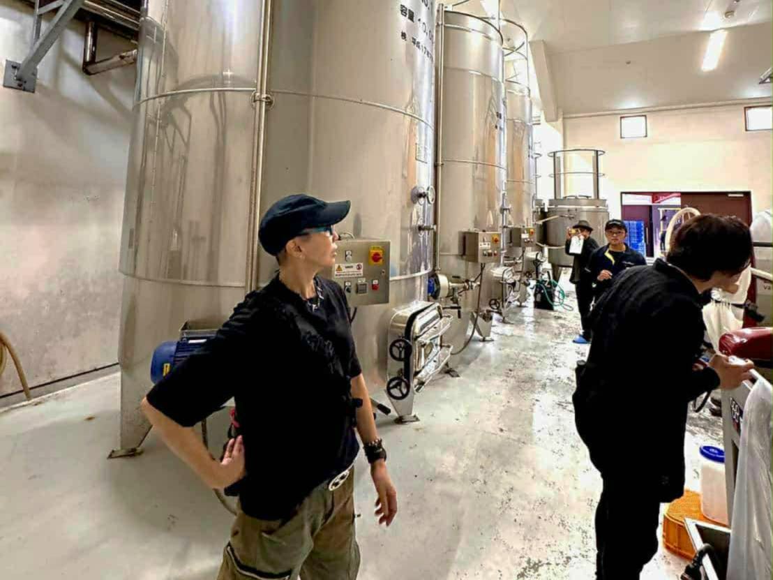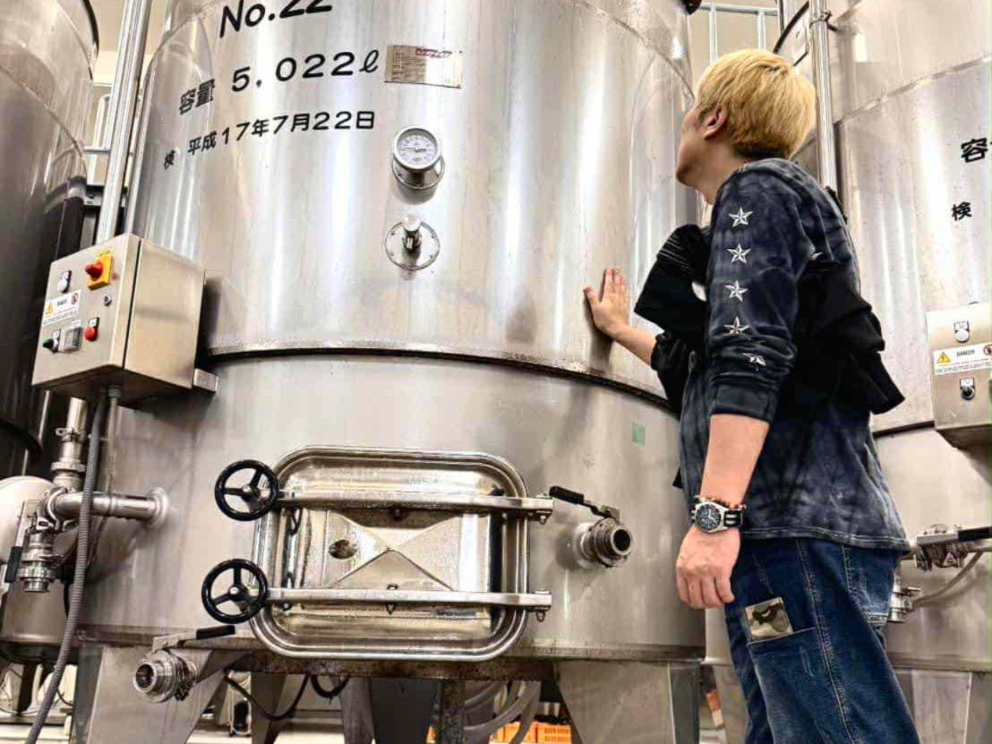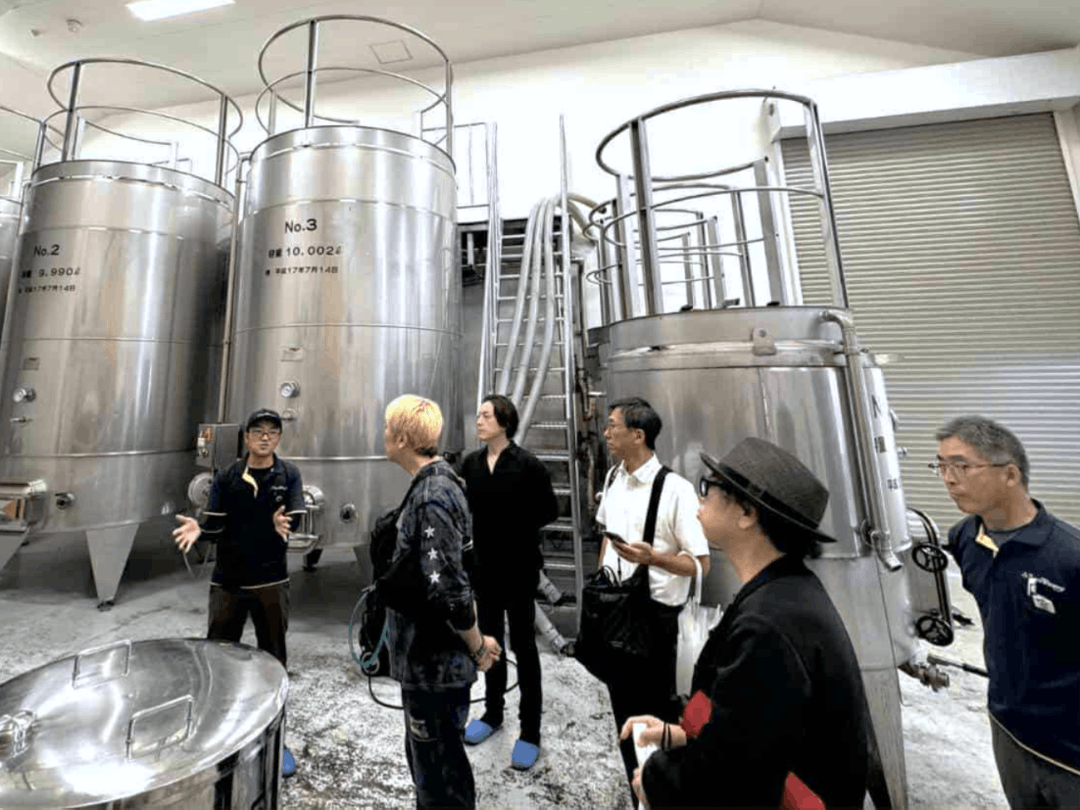 続いて、ワインの香りが漂う醸造所へ。まさに醸造中のワインの鼓動を感じる空間で、ミレイヒロキ氏は醸造長の解説に耳を傾けながら、ワインが形になるプロセスを真剣に見つめていました。その眼差しには、この場での体験がやがてアートラベルに映し出されていく予感が感じられました。