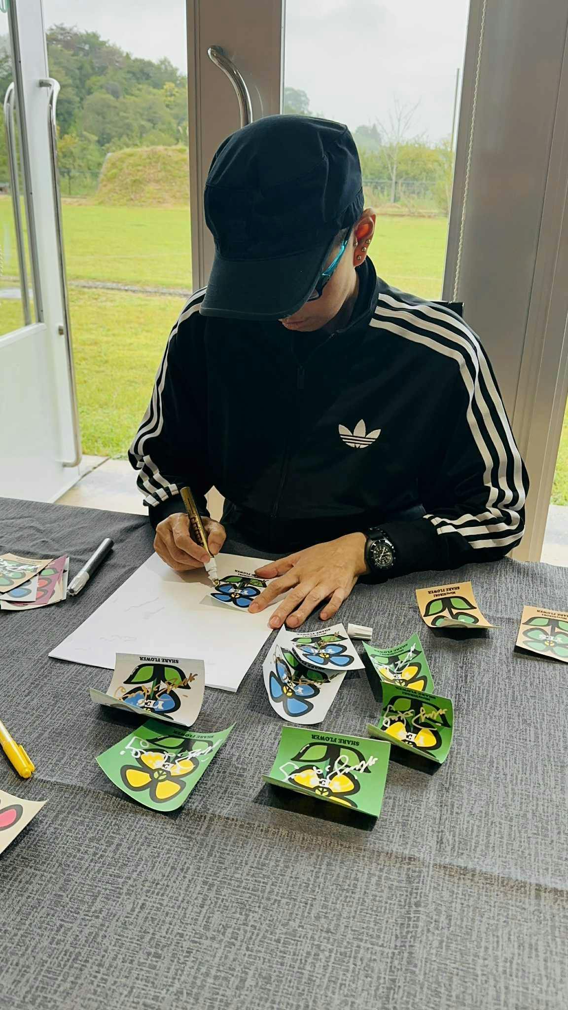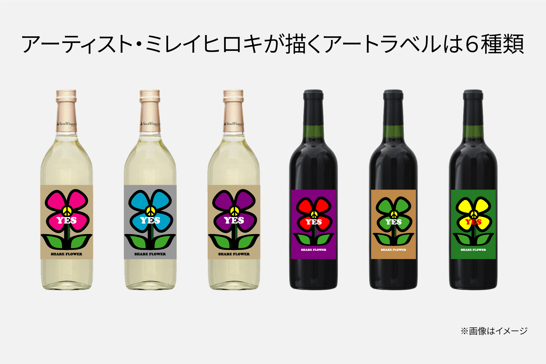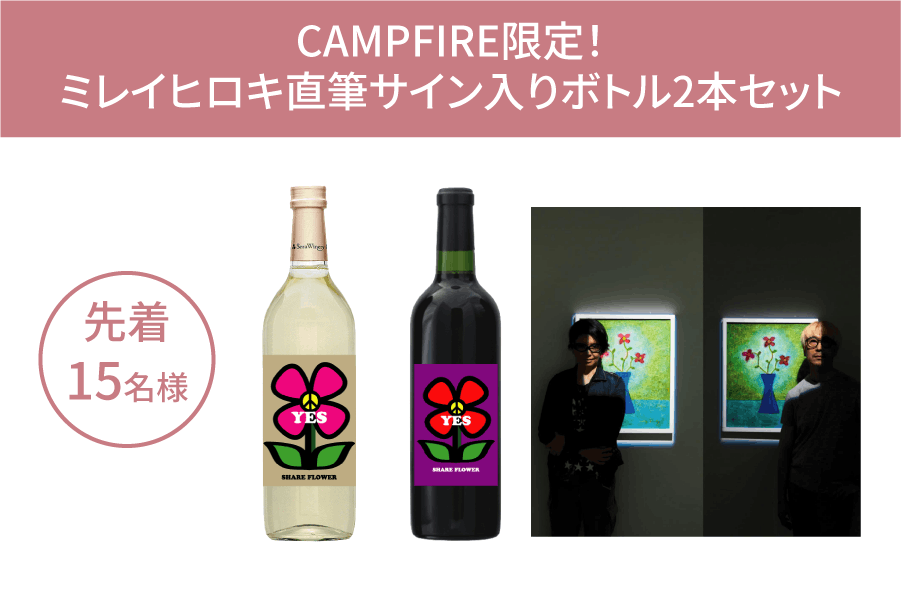 アーティスト・ミレイヒロキが描く花の祈りを込めたアートラベルのオリジナルワインセット。今回CAMPFIREのために、特別にアーティスト・ミレイヒロキ直筆サイン入りボトルをご用意しました。ミレイヒロキ氏がデザインしたアートラベルに直筆でサインを入れていただきます。