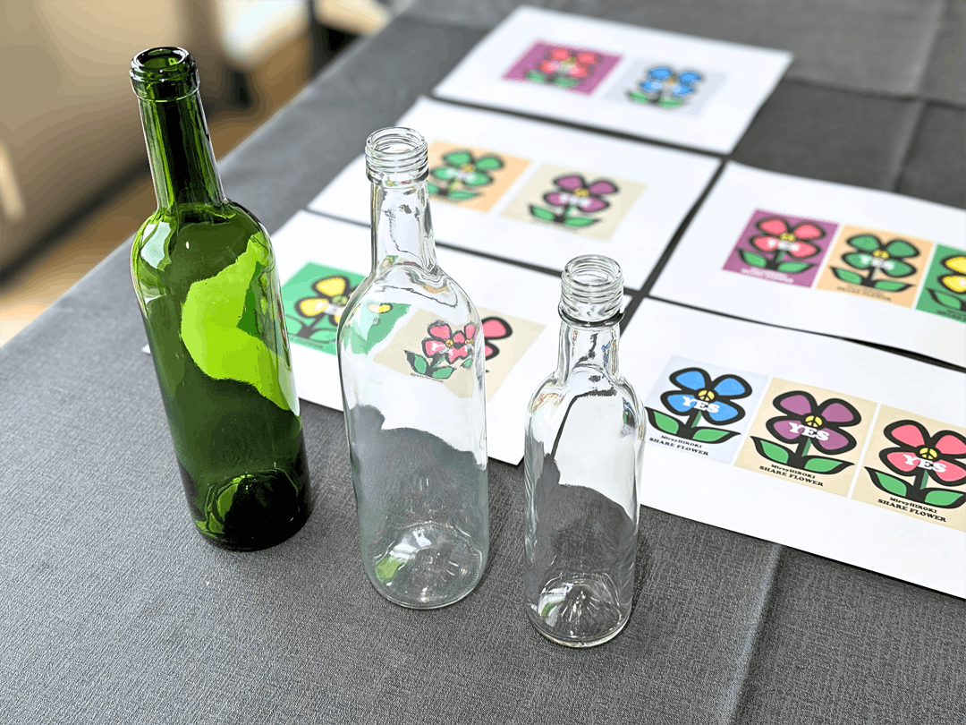 今回プロジェクトのオリジナルワインに使われるワインボトルに、実際にアートラベルを貼って見え方を確認してみながら、最終デザインを調整していきます。