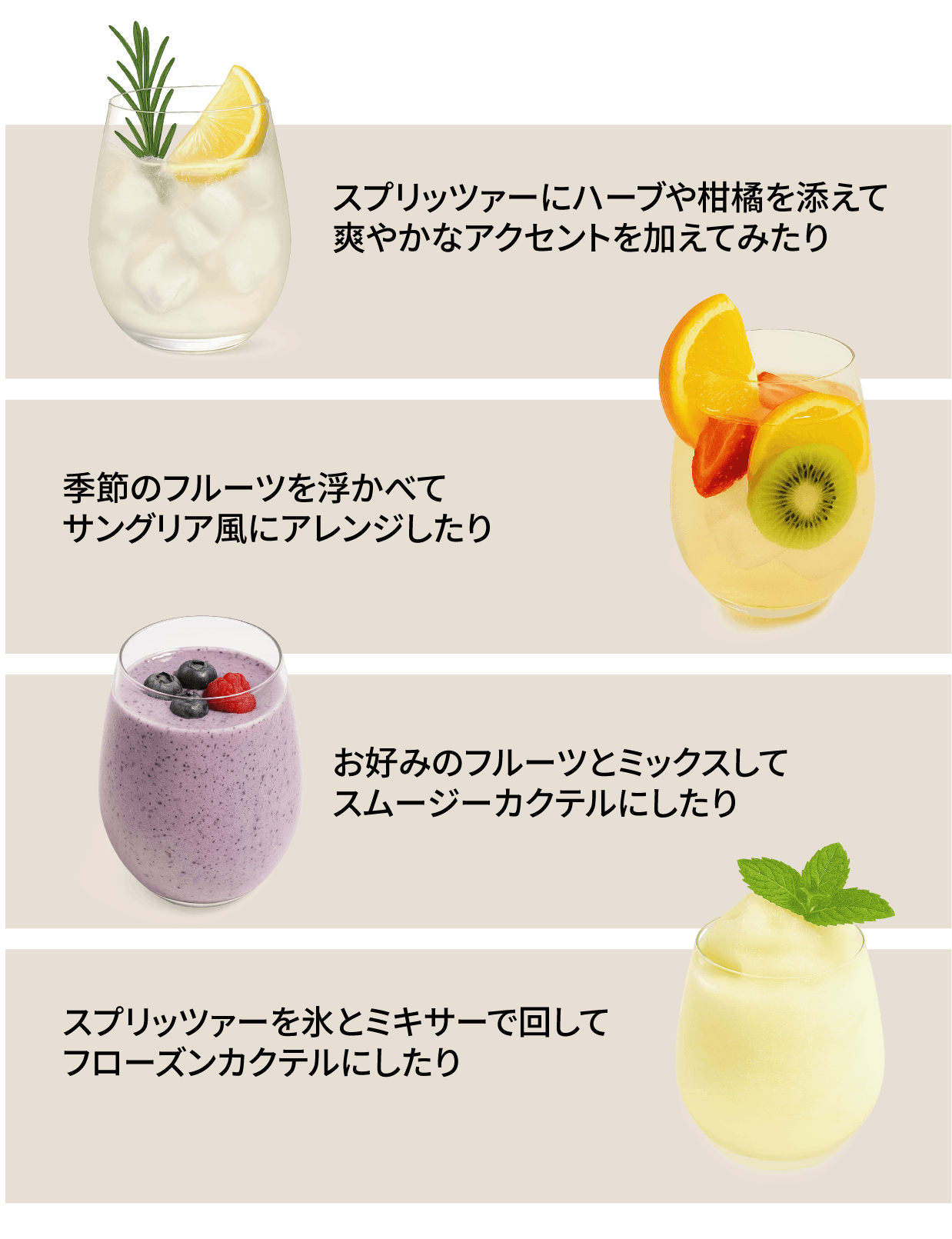 スイーツ・スプリッツァーをはじめ、フルーツやハーブを加えるなど、