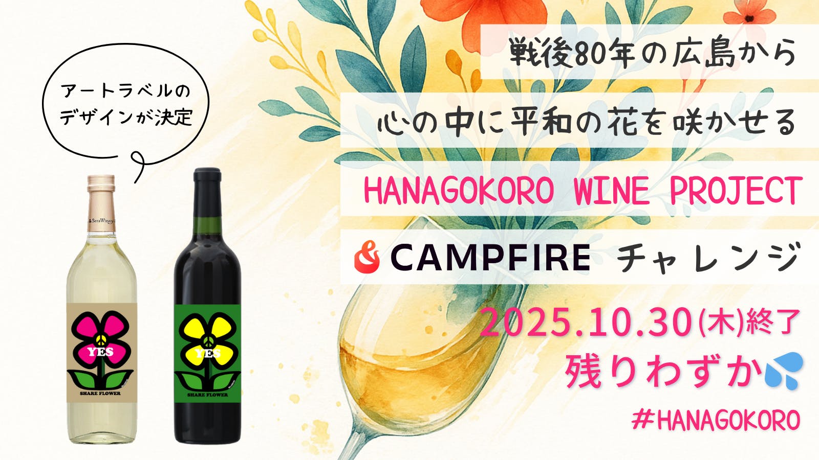戦後80年・昭和100年という歴史的な節目を迎える2025年に、広島からワインを通じて「平和への想い」を届ける日本ワインプロジェクトです。花の祈りを描き続けるアーティスト・ミレイヒロキ氏が手がけるアートラベルが命を吹き込んだオリジナルワインを手にする一人ひとりの"心の中に、平和の花を咲かせる"ことを目指しています。