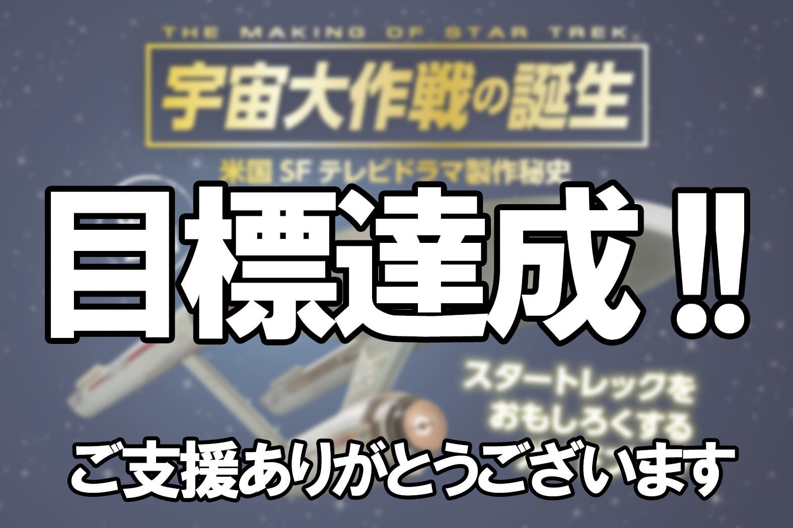 ご支援いただきました皆さま、ありがとうございます!おかげさまで目標金額を達成しました。『スタートレック』の素晴らしさ、おもしろさを皆さんに知ってほしい!そんな思いを胸に本書の編集作業を進めております。次なる目標200%、300%に向かい、邁進してまいります。引き続き、ご支援くださいますよう、よろしくお願いいたします。現在、ストレッチゴールの設定とリターン品の追加を試作しています。 詳しくは追って発表いたします。