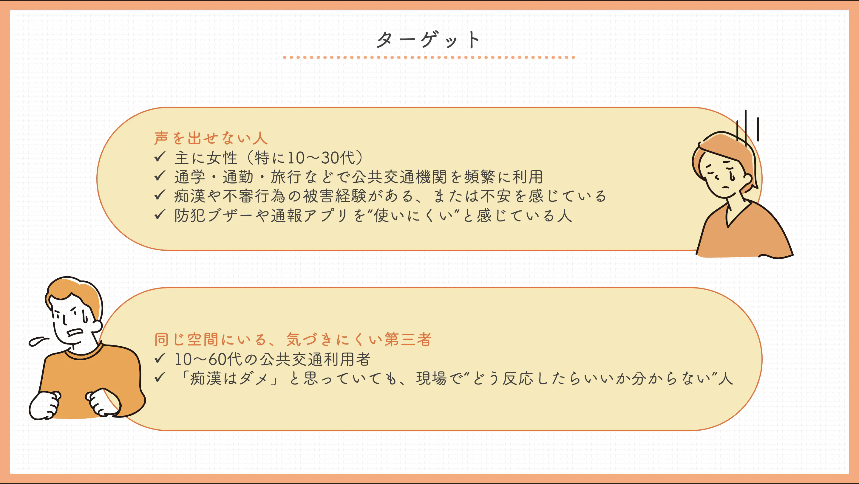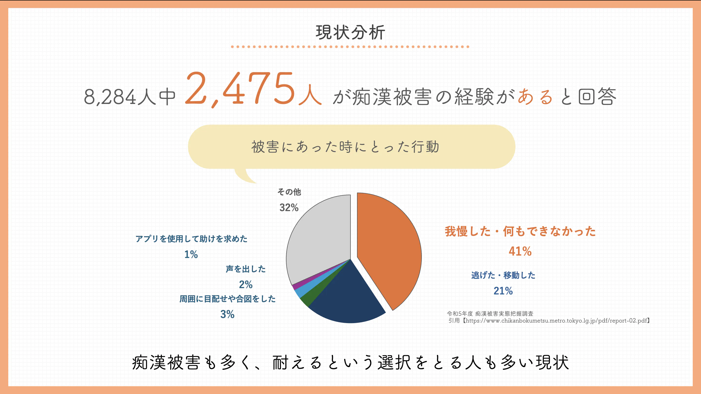 そして現在、卒業制作のプロジェクトに 「声を上げられない痴漢被害者を支える社会の仕組みづくり」 をテーマとして掲げ、安心して移動できる公共空間の実現を目指して取り組んでいます。