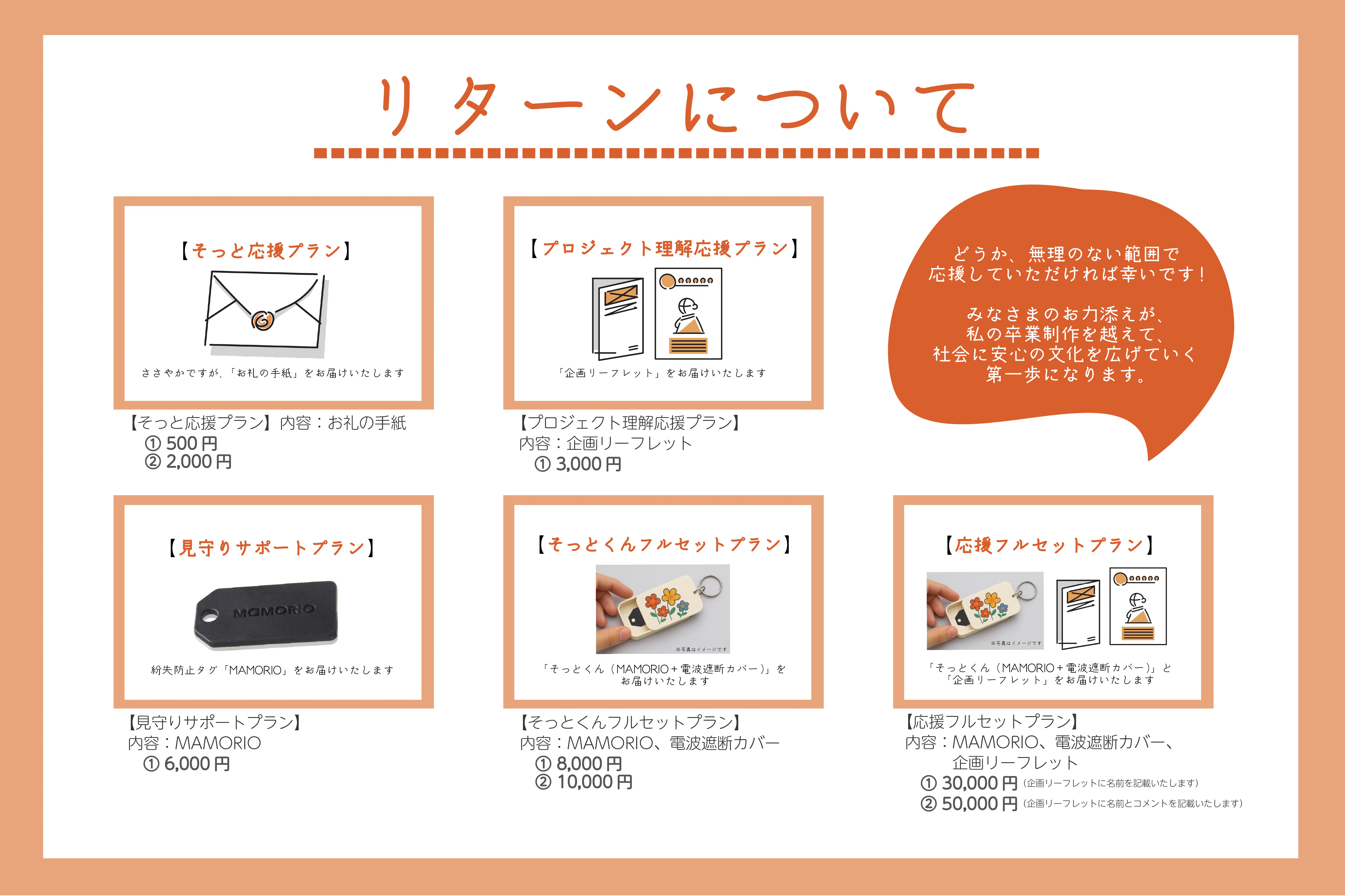 そのため、NEARIZE様のご協力のもと今回リターン品として提供させていただきます。 - ・「そっとくん(MAMORIO+電波遮断カバー)」の提供