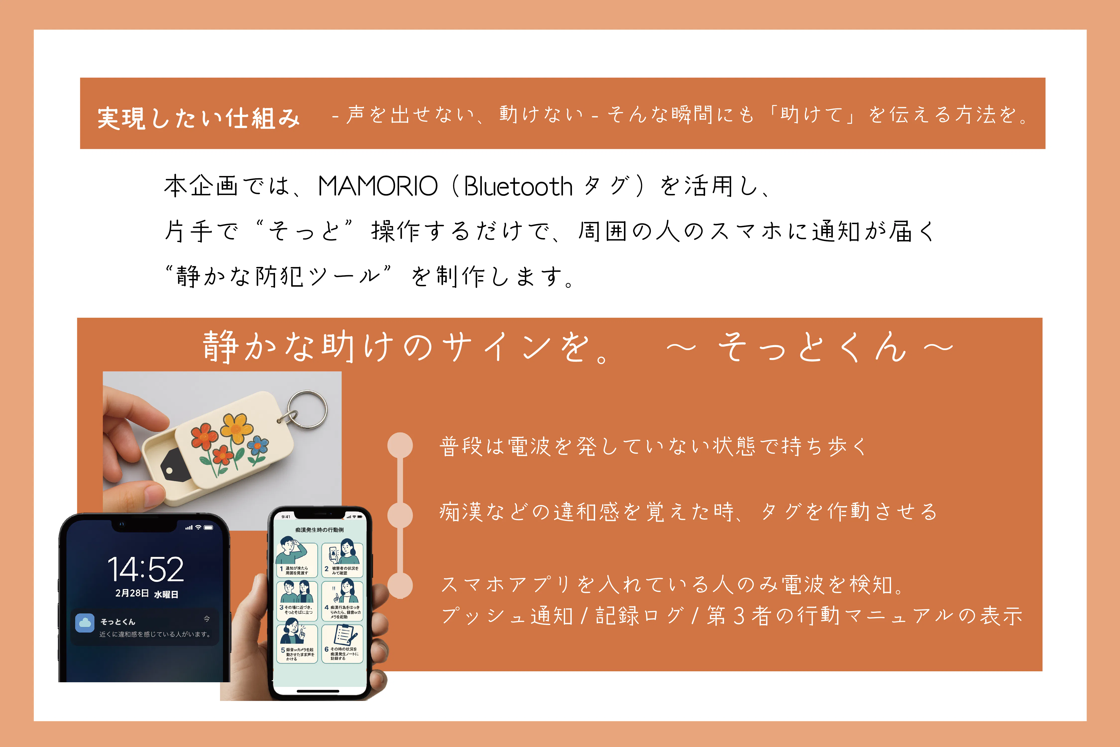 本企画では、Bluetoothタグと電波遮断カバーを活用し、片手で“そっと”操作するだけで、周囲の人のスマホに通知が届く“静かな防犯ツール”「そっとくん」を制作します。
