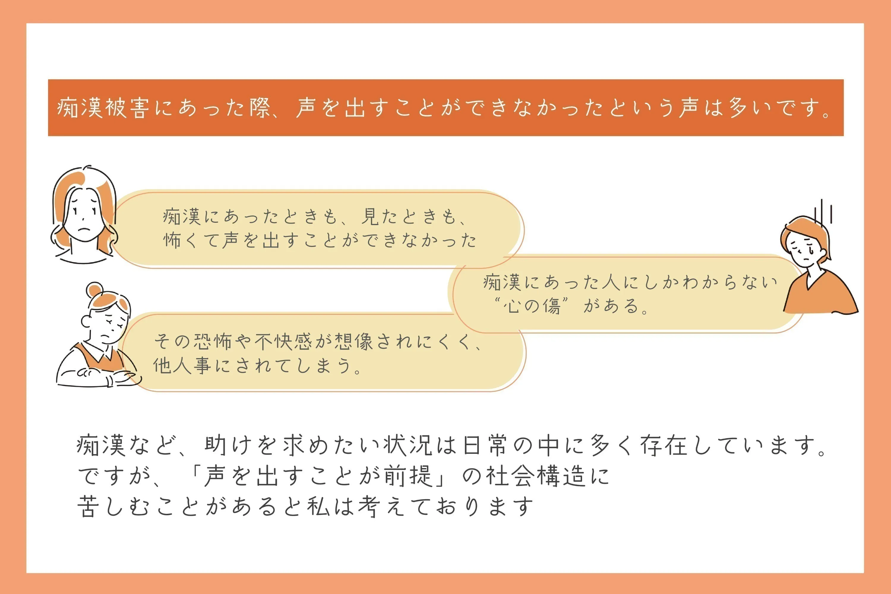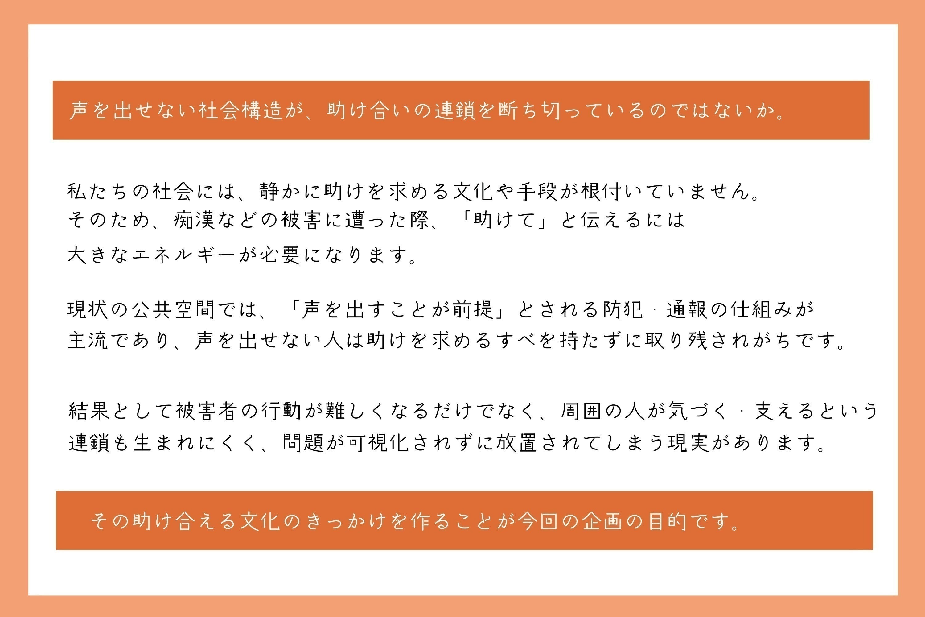 被害者に寄り添えていないのは、“助けを求められない社会の仕組み”ではないでしょうか?声を出すこと・ブザーを鳴らすことを前提とした従来の防犯ツールだけでは、本当に困っている人を助けきれていない現実があります。