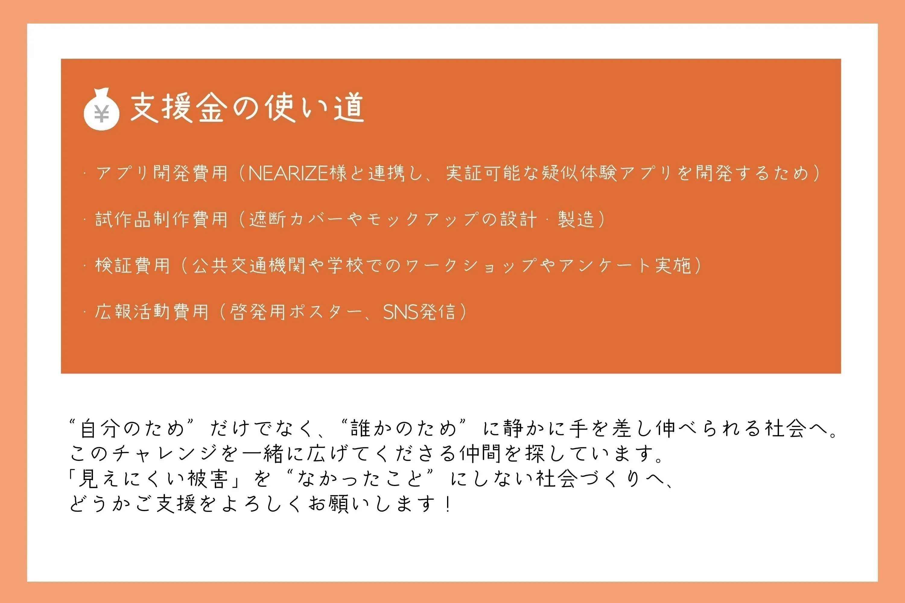 2025/11/06 13:00みなさん、温かいご支援と応援を本当にありがとうございます。ご報告が遅くなってしまいましたが、「痴漢被害の見えにくさを乗り越える企画プロジェクト」は、無事にクラウドファンディングの募集期間を終えることができました。おかげさまで、29名の支援者様から合計240,500円のご支援をいただきました。心より感謝申し上げます。クラウドファンディングを通じて、たくさんの方にこのプロジェクトの想いや、「そっとくん」の存在を知っていただくことができました。ひとつひとつの応援コメントやメッセージが、活動を続ける大きな力になりました。この挑戦は、誰かを“守る”ことだけでなく、「やさしさを行動に変える文化を育てる」という想いから始まりました。少しずつですが、その輪が広がっていることを実感しています。今後は、「そっとくん」アプリの試作・検証に取りかかります。電波遮断カバーの改良や通知システムの調整を行い、実際に“声を出さずに助けを伝える”仕組みづくりを進めていきます。また、12月には仙台市内の高等学校にて、高校生と一緒に「安心を支える行動」について考えるワークショップを実施予定です。現場の声を集めながら、より現実的でやさしい仕組みを形にしていきます。あらためて、応援してくださったすべての皆さまに心より感謝申し上げます。お礼のご報告が遅くなり申し訳ありません。クラウドファンディングは終了しましたが、この活動はこれからが本当のスタートです!引き続き、SNSでの応援や見守りの言葉をいただけたら嬉しいです。一人でも多くの人に、やさしさが届きますように。本当にありがとうございました。 もっと見る活動報告|ご支援20万円を突破しました。