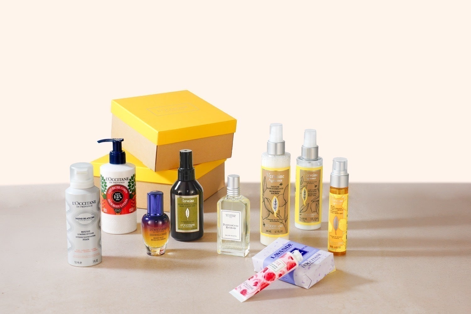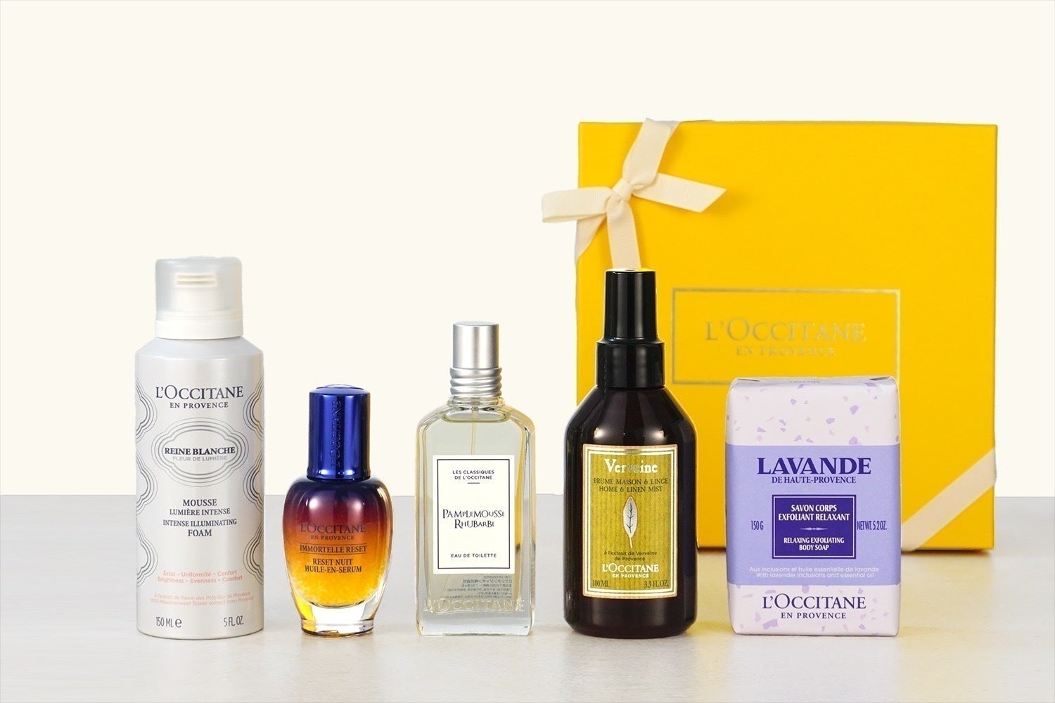 レーヌブランシュ イルミネイティング クレンジングフォーム(美容液・150ml)、イモーテル オーバーナイト リセットセラム(夜用美容液・30ml)、パンプルムース ルバーブ オードトワレ(香水・50ml)、ヴァーベナ リネンミスト(布用フレグランス・100ml)、ラベンダー フラワーソープ (石鹸・150g)、RePLAMO(1体)