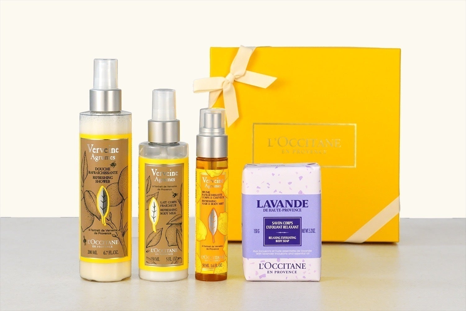 シトラスヴァーベナ バイカラーシャワージェル(ボディ洗顔料・200ml)、シトラスヴァーベナ モイスチャースプレー(ボディ用乳液・150ml)、シトラスヴァーベナ ボディヘアミスト(化粧水・50ml)、ラベンダー フラワーソープ (石鹸・150g)、RePLAMO(1体)