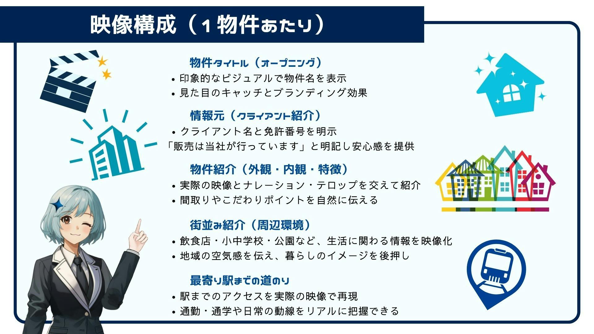 ・1物件=1動画 を基本とし、VTuberが街や物件を案内