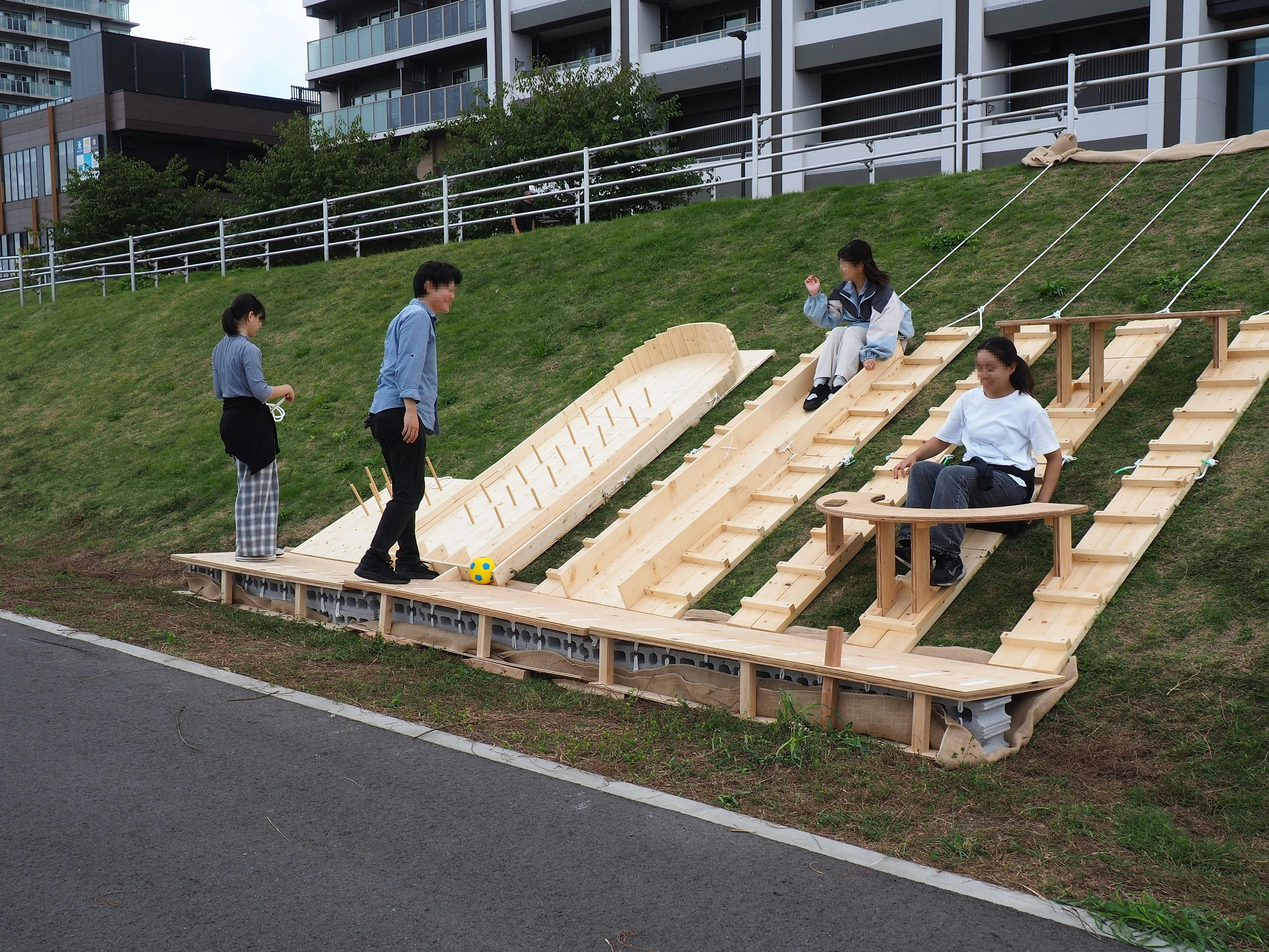 そんな想いから、河川敷の傾斜を活かし、傾斜だからくつろげる、楽しめるような家具や遊具を『どてファニチャー』と名付け、研究を始めました。