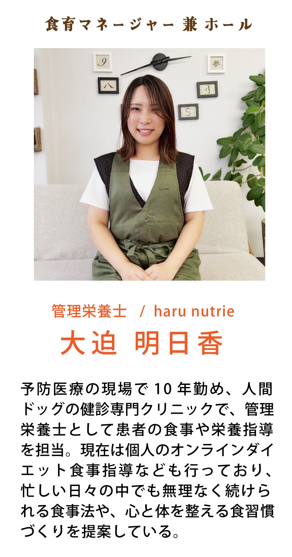 さらに、食育マネージャー兼ホールとして、管理栄養士(国家資格)の大迫明日香さんも仲間入りしてくれました!
