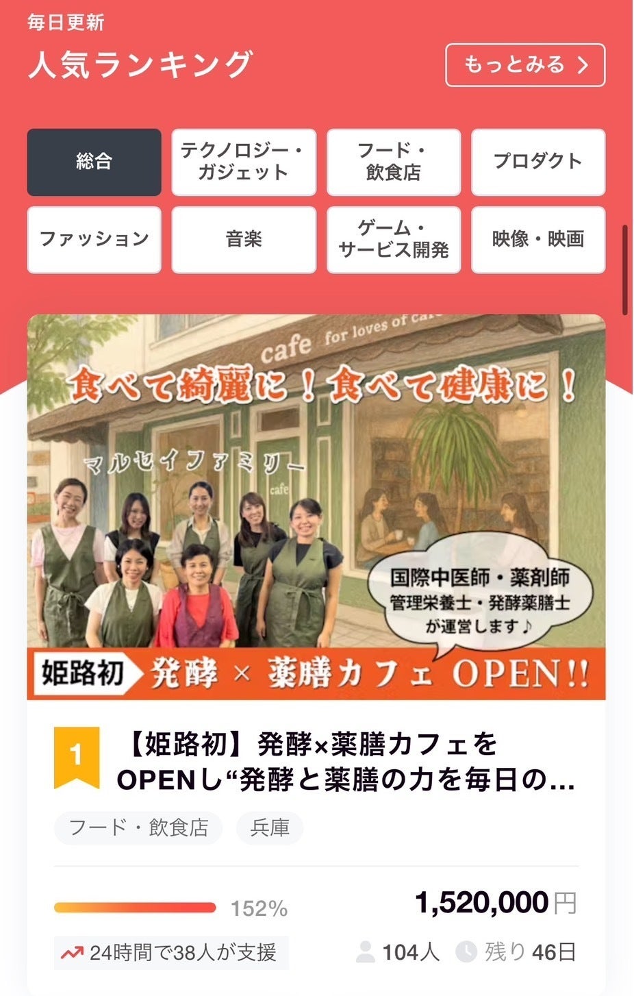 2025/10/11 12:03昨日マルセイ初のクラウドファンディング『姫路初の発酵薬膳カフェ』への挑戦がな、な、なんと、200万円に到達しました本当にありがとうございます(´;ω;`)クラファン開始から、はやもう1ヶ月たち、あっという間に残り2週間となりました!!長かったような短かったような・・・毎日いろんな人に会うたびに、『カフェほんまに楽しみにしてます!!』とたくさんの方にご支援、お声がけいただき本当に感謝が絶えない1ヶ月を過ごしてまいりました。ぶっちゃけまだお店できてもですし飲食業界初めての素人で(料理担当はプロですが)どんな料理が、いくらで、どんな内容で出てくるか一切分からんお店に、たとえ100円でも1000円でもお金を出してもらえるなんて、ほんまに奇跡なことだと思うのです。毎秒ごとに、ありがとうの気持ちしか湧き上がって来ません。私たちはもういわゆる『ネクストゴールド』的なのは設けてません。ただひたすらに、一人でも多くの方に私たちの想いが届いて、一緒に発酵薬膳カフェのプロジェクトを育ててくれる『仲間』や『共犯者』になってくださったら嬉しいなぁという思いです!写真時点で総支援者数149人。149人ってすごいことやと思います!!!それが150名になったらほんま嬉しいし、151名になったら、もっともっと嬉しい!!!そんな思いで、10/25のクラファン最後の日まで全力でかけぬけつつ一番大事なカフェオープンに向けてやるべきことを地道に毎日コツコツ重ねていきたいと思いますので、ぜひ、最後まであたたかく見守ってやってください本当にありがとうございます!!!ーーーーーーーーーーーーーーーーーーー※クラファン終了まで、あと15日(〜10/25)[姫路初☆発酵×薬膳カフェ⭐︎12月OPEN!]ひとときではありますが、9/9 皆様のおかげで姫路発のこのプロジェクトがクラウドファンディング総合人気ランキング[全国1位]になれました♡共感して下さいましたらぜひ応援いただきまして一人でも多くの方が、一緒にこのプロジェクトを育てていく"仲間"になって下さると嬉しいです(^^)/ もっと見る