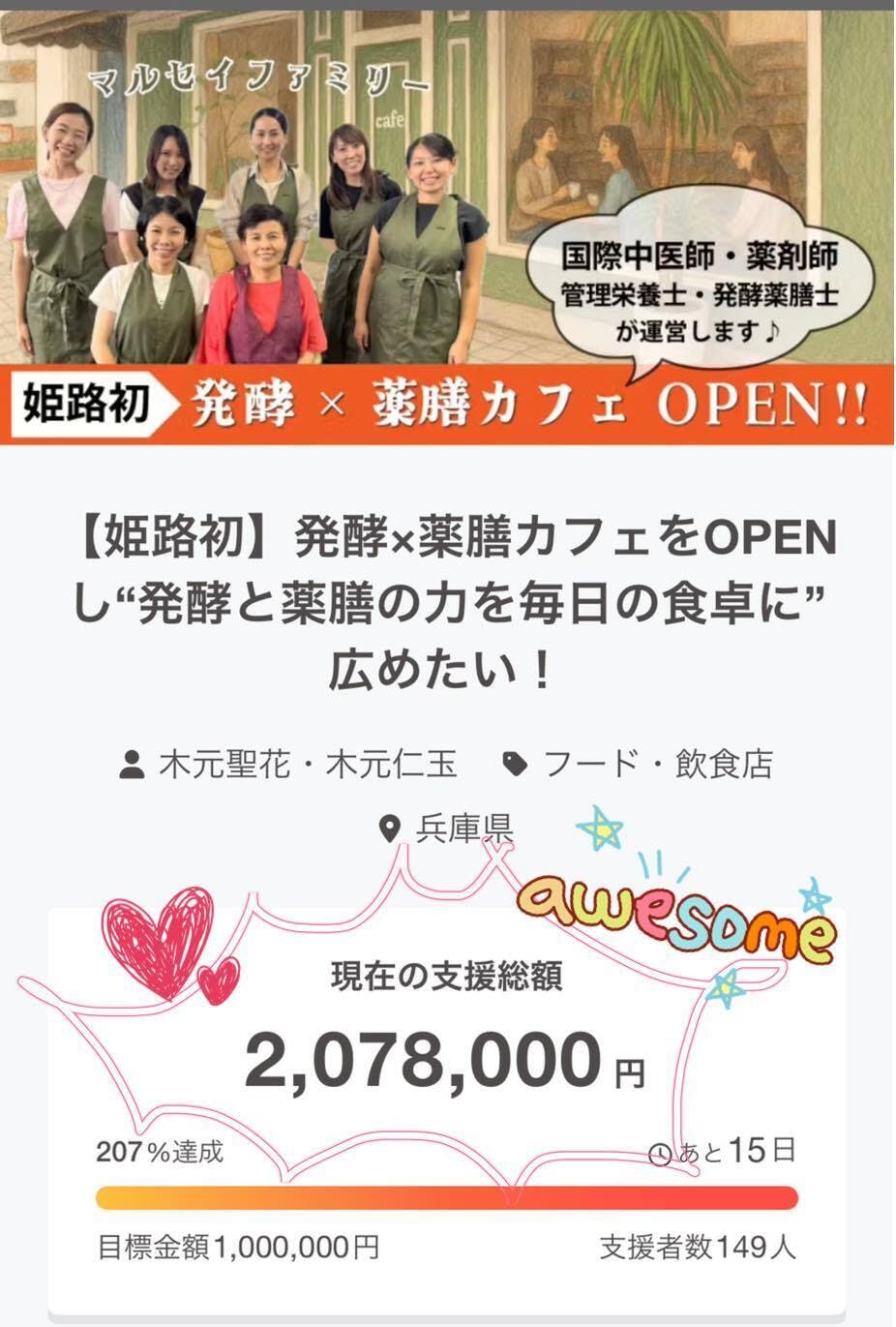 2025/10/11 12:03昨日マルセイ初のクラウドファンディング『姫路初の発酵薬膳カフェ』への挑戦がな、な、なんと、200万円に到達しました本当にありがとうございます(´;ω;`)クラファン開始から、はやもう1ヶ月たち、あっという間に残り2週間となりました!!長かったような短かったような・・・毎日いろんな人に会うたびに、『カフェほんまに楽しみにしてます!!』とたくさんの方にご支援、お声がけいただき本当に感謝が絶えない1ヶ月を過ごしてまいりました。ぶっちゃけまだお店できてもですし飲食業界初めての素人で(料理担当はプロですが)どんな料理が、いくらで、どんな内容で出てくるか一切分からんお店に、たとえ100円でも1000円でもお金を出してもらえるなんて、ほんまに奇跡なことだと思うのです。毎秒ごとに、ありがとうの気持ちしか湧き上がって来ません。私たちはもういわゆる『ネクストゴールド』的なのは設けてません。ただひたすらに、一人でも多くの方に私たちの想いが届いて、一緒に発酵薬膳カフェのプロジェクトを育ててくれる『仲間』や『共犯者』になってくださったら嬉しいなぁという思いです!写真時点で総支援者数149人。149人ってすごいことやと思います!!!それが150名になったらほんま嬉しいし、151名になったら、もっともっと嬉しい!!!そんな思いで、10/25のクラファン最後の日まで全力でかけぬけつつ一番大事なカフェオープンに向けてやるべきことを地道に毎日コツコツ重ねていきたいと思いますので、ぜひ、最後まであたたかく見守ってやってください本当にありがとうございます!!!ーーーーーーーーーーーーーーーーーーー※クラファン終了まで、あと15日(〜10/25)[姫路初☆発酵×薬膳カフェ⭐︎12月OPEN!]ひとときではありますが、9/9 皆様のおかげで姫路発のこのプロジェクトがクラウドファンディング総合人気ランキング[全国1位]になれました♡共感して下さいましたらぜひ応援いただきまして一人でも多くの方が、一緒にこのプロジェクトを育てていく"仲間"になって下さると嬉しいです(^^)/ もっと見る