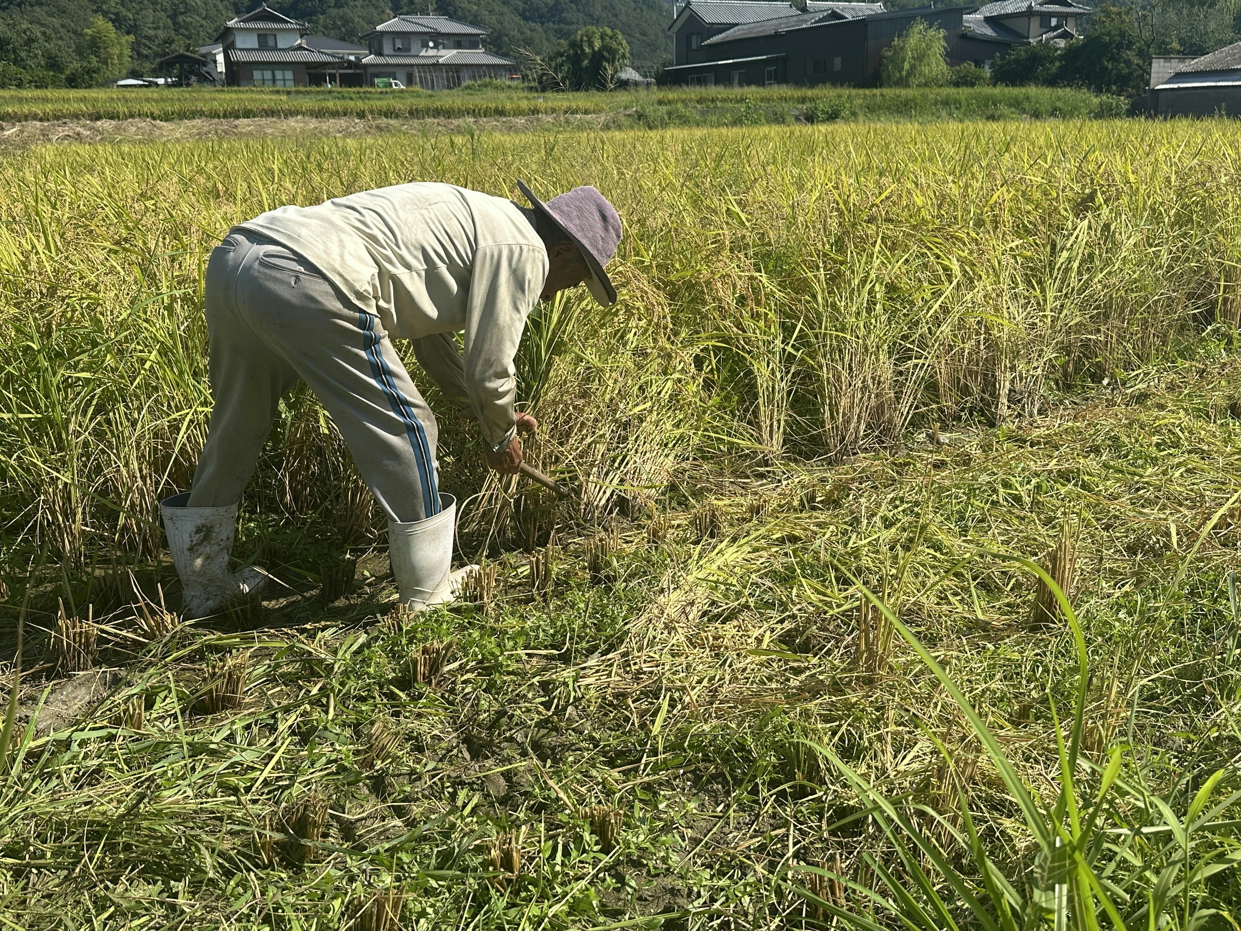 コンバインが入らない場所は全て手刈りで収穫しています。