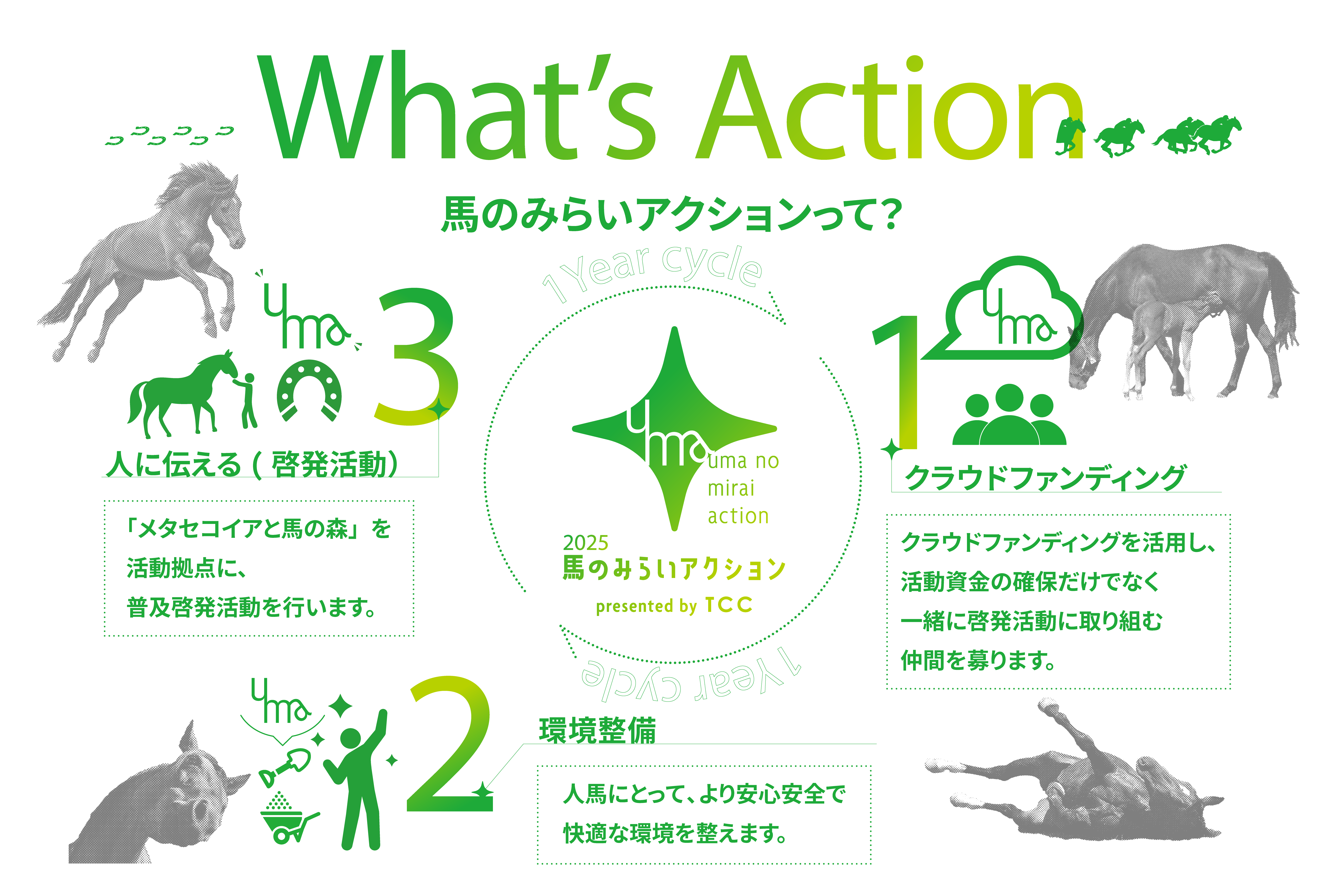 そして今年は 6年越しの念願がようやく叶い、普及啓発活動の拠点となる観光養老牧場「メタセコイアと馬の森」(滋賀県高島市)をオープンすることができ、この度 満を持して 3年ぶりの取り組みとなります「馬のみらいアクション 2025」を立ち上げました。