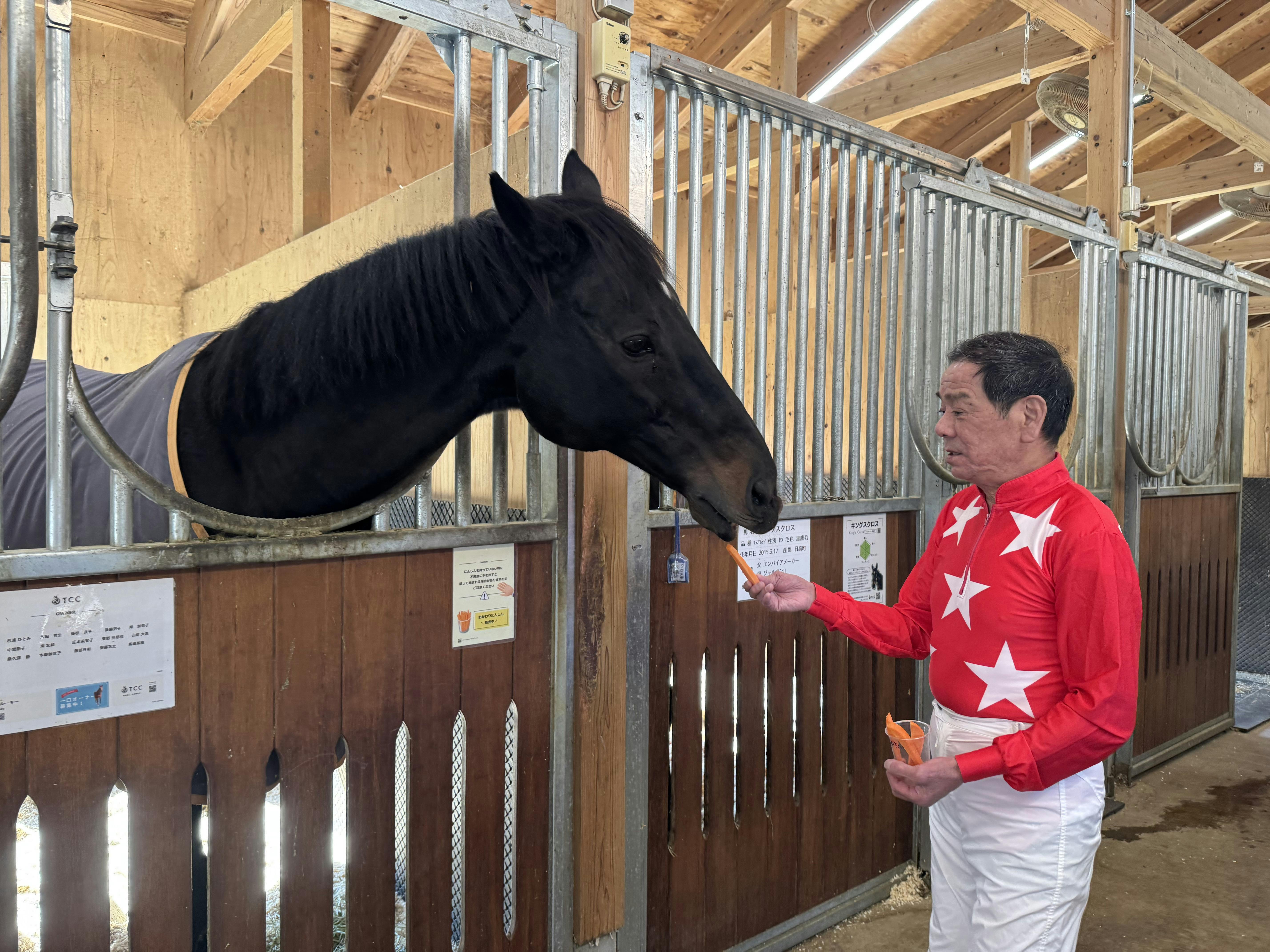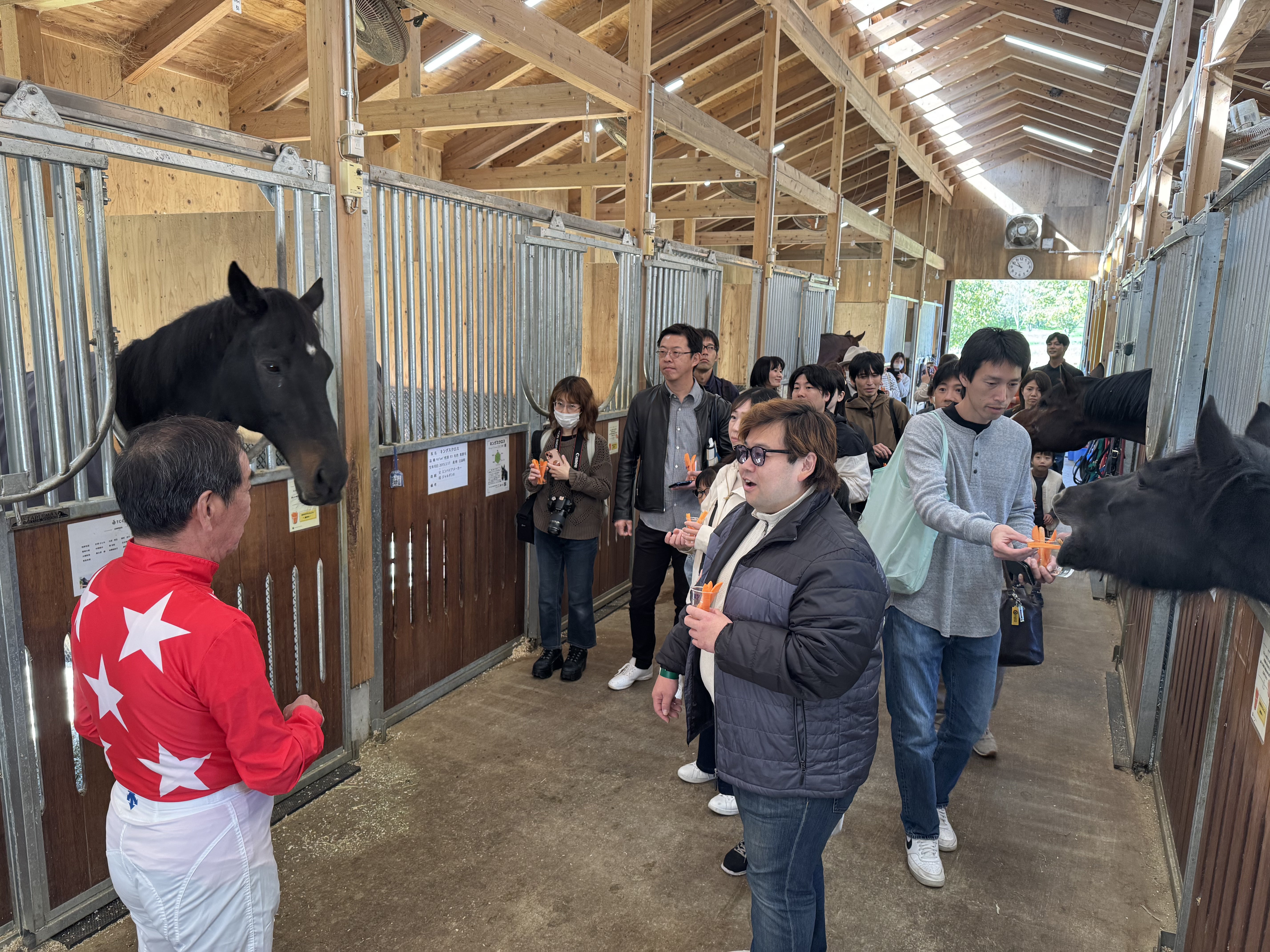 まずは現役時代に使用されていた勝負服・ジョッキーパンツ・ブーツを着用され、厩舎見学からスタート。