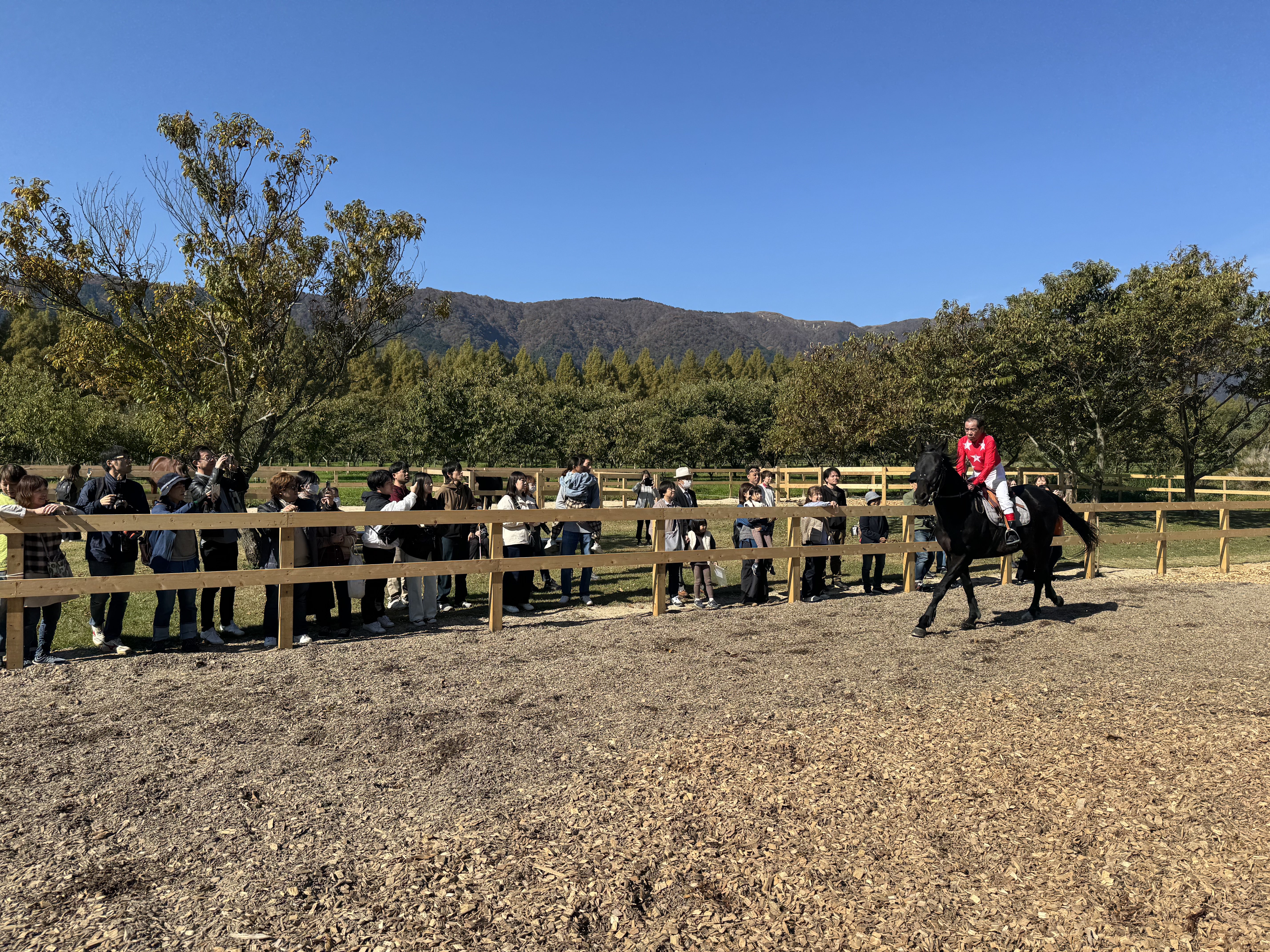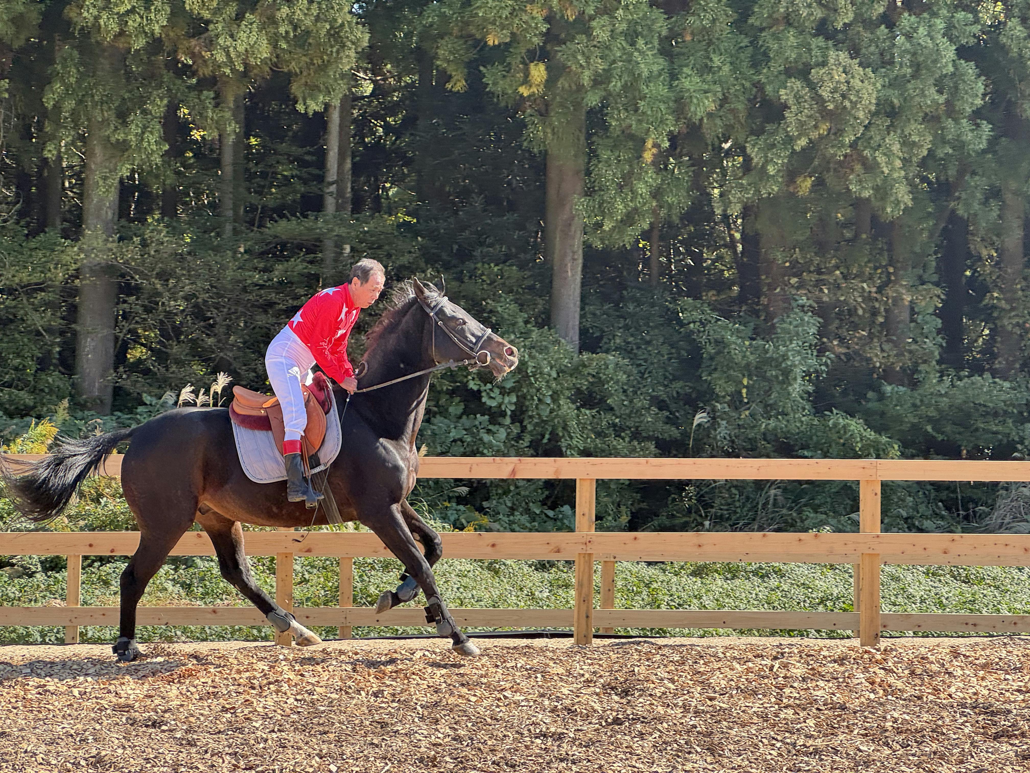 このクラウドファンディングのご支援を通して完成した新しい角馬場にて、皆さんの前で華麗な騎乗姿を見せてくれました。