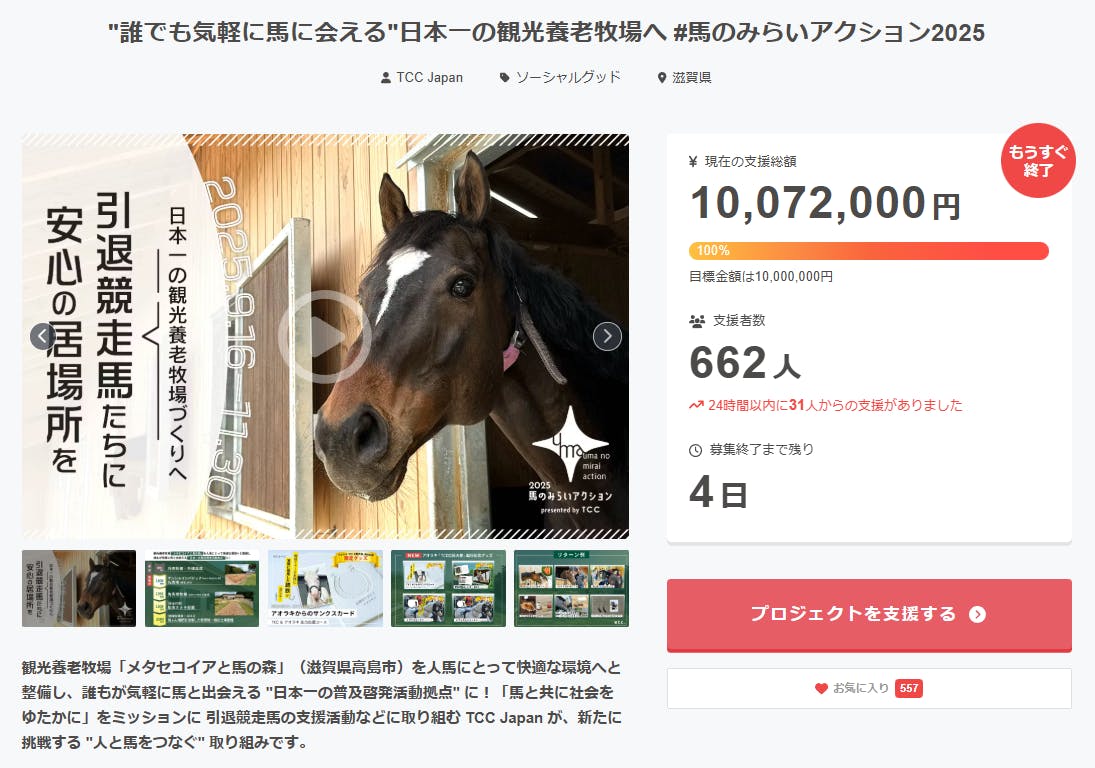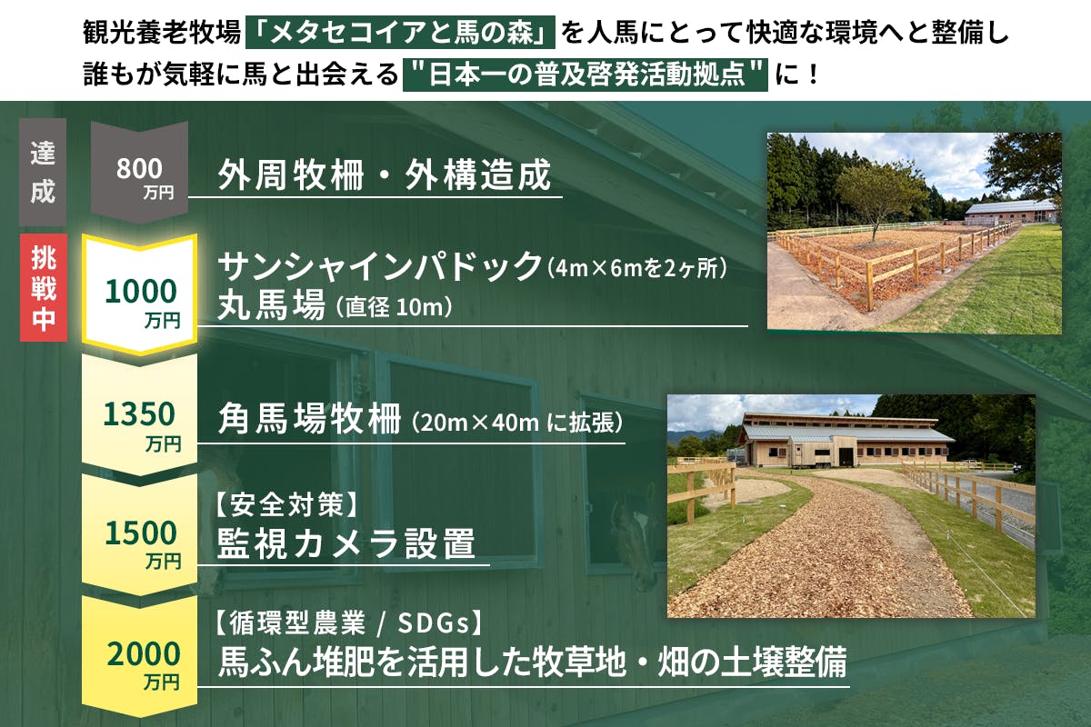 このクラウドファンディング「#馬のみらいアクション2025」と並行して、「メタセコイアと馬の森」の環境整備工事を進めてきましたが、予算オーバーや手つかずの部分も残っていますので、残りの期間で【ネクストゴール 1350万円】を目指していきたいと思います!
