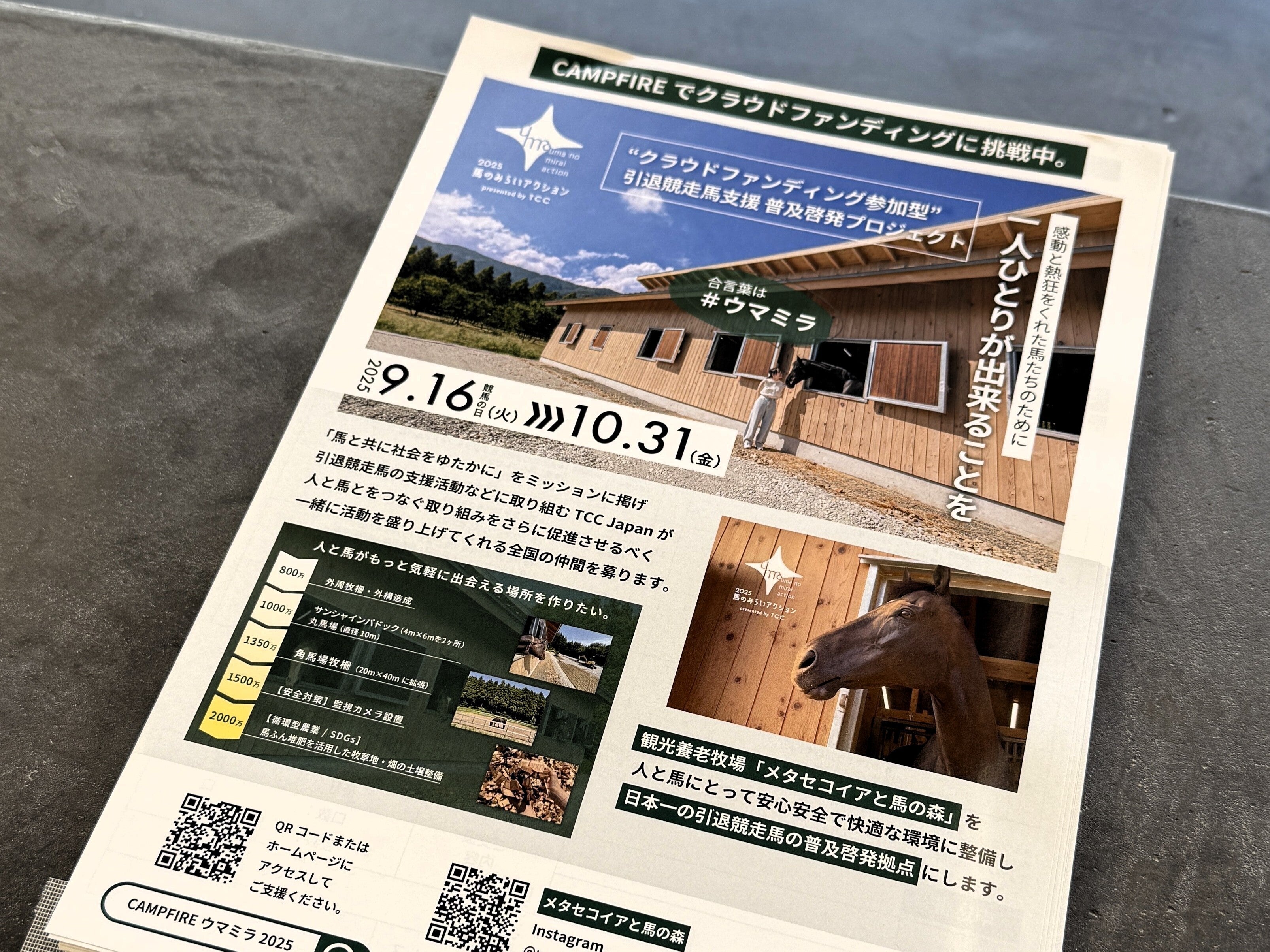 皆さま、こんばんは!「#馬のみらいアクション2025」は、ついに【支援者数 100名】を突破しました。【支援者数 104名】【支援総額 1,781,500円】ものご支援、本当にありがとうございます。先日 2日間にわたって開催しました「芝張りワークショップ」では、総勢 37名ものボランティアの皆さまの力を借りて、厩舎周辺や新設されたサンシャインパドック・丸馬場の周辺の芝張り、またウッドチップの運搬が完了しました。ご参加いただいた皆さまに、心から感謝申し上げます。当日の様子はこちら > https://camp-fire.jp/projects/876406/view/activities/757998#main施設内の整備工事も進んでおり、皆さまの力をお借りして「メタセコイアと馬の森」が徐々に人馬にとって過ごしやすい環境に整ってきました。進捗報告はこちら > https://camp-fire.jp/projects/876406/view/activities/758971#mainさて今回は、さらなる環境整備のボランティアさまを募集します。今回のワークショップでは、ホースステーションから厩舎までの道の両側に「グリーンガーデン」を作ります!ここで暮らす馬たちの ”馬ふん堆肥” を活用したガーデンに、苗や球根を植えるワークショップです。人馬にとって居心地の良い環境づくりのため、ぜひご参加をお待ちしております。▼お申込みはこちらhttps://forms.gle/ZjnDnWQqDZ8gKm2M8-----------------------------------------------------------------------------------------------【日時】2025年10月26日(日) 9:30〜12:00※雨天の場合は 11月1日(土) に順延(開催可否は 3日前に決定)【スケジュール】9:30 受付開始〜集まり次第作業の流れを説明 ※公共交通機関でお越しの場合は、9:01 マキノ駅発のバスをご利用ください。 ※途中参加・退出不可。やむを得ない場合は、事前に TCC事務局までご相談ください。10:00 作業開始12:00 作業終了〜昼食午後はお時間の許す限り、メタセコイアと馬の森をお楽しみください。【定員】10名程度※TCC 非会員さまもお申込み可能です。※お申込み時点で参加確定となります。定員に達し次第、募集を締め切る可能性があります。【参加費】無料※現地までの交通費はご負担ください。【参加特典】①イベント参加者から大好評の地元食材を使った「特製弁当」をご用意(お茶付き)②厩舎見学 無料【場所】滋賀県高島市マキノ町寺久保833-1※お車でお越しの場合は、隣接するマキノピックランドの駐車場をご利用ください。【服装・持ち物】動きやすく、汚れても良い服装でお越しください。軍手・長靴・帽子・タオル・飲み物など-----------------------------------------------------------------------------------------------引き続き、応援をよろしくお願いいたします。--------------------------------------------------TCC 引退競走馬ファンクラブ「入会金無料キャンペーン」実施中!https://tcc-japan.com/--------------------------------------------------#TCCJapan #TCC引退競走馬ファンクラブ #TCCホース #TCC会員 #引退競走馬 #引退競走馬支援 #馬と共に社会をゆたかに