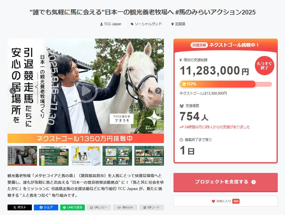 2025/12/01 07:44昨日 11月30日(日) をもって、クラウドファンディング「#馬のみらいアクション2025」が終了しました。「競馬の日」9月16日(火) にスタートしてから約 2か月間、たくさんの応援ご支援をありがとうございました!【支援総額】13,218,500円(目標金額 1,000万円)【支援者数】879名大変多くの方にご支援をいただき、また「TCC 広報大使」として引退競走馬の普及啓発活動や PR に協力してくれたアオラキの影響力も大きく、無事に目標金額を達成することができました。いただいたご支援は、観光養老牧場「メタセコイアと馬の森」(滋賀県高島市)の施設環境整備に大切に活用させていただきます。そして今ここで暮らしている馬たちはもちろん、今後も一頭でも多くの馬たちが幸せな余生を過ごせるよう、TCC の活動にも今まで以上に尽力してまいります。ご支援いただいた皆さまは、リターンの準備・発送を楽しみにお待ちください。まずは取り急ぎの御礼となりますが、これからもあたたかい応援をどうぞよろしくお願いいたします。TCC Japan - 馬と共に社会をゆたかに -観光養老牧場「メタセコイアと馬の森」 もっと見る