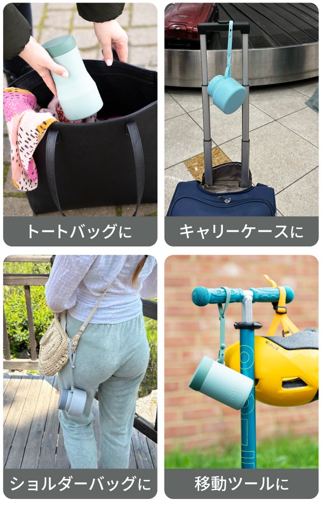 付属の便利な専用ストラップを使えば、バッグや車椅子などに簡単に取り付けられます。