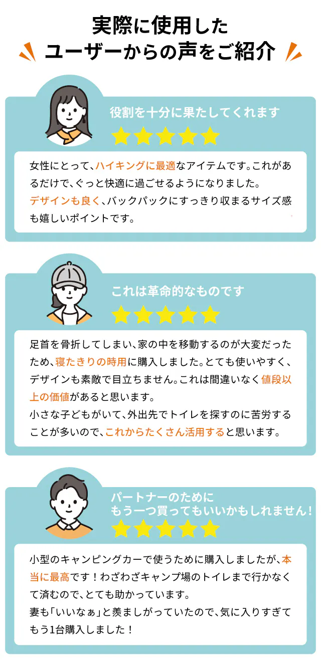 もともとは育児中の"外出先のトイレ問題"から生まれましたが、その機能性と信頼性が評価され、今では子供だけでなく、大人・高齢者・医療現場・トラックドライバー・現場作業員など様々な現場で選ばれる存在となっています。