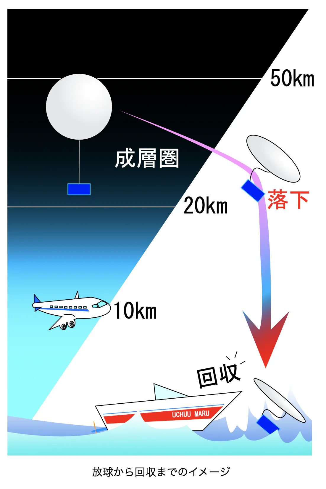 宇宙気球は巨大な風船にヘリウムガスを詰めて成層圏へと飛ばします。エンジンなどは搭載していないため、当日の気象データとGNSSの発信データを使って、弊社および提携業者が軌道を予測して回収します。時々、回収不能になることもあります。回収不能の場合は自分フィギュア(TM)だけでなく映像データも回収できないということです。