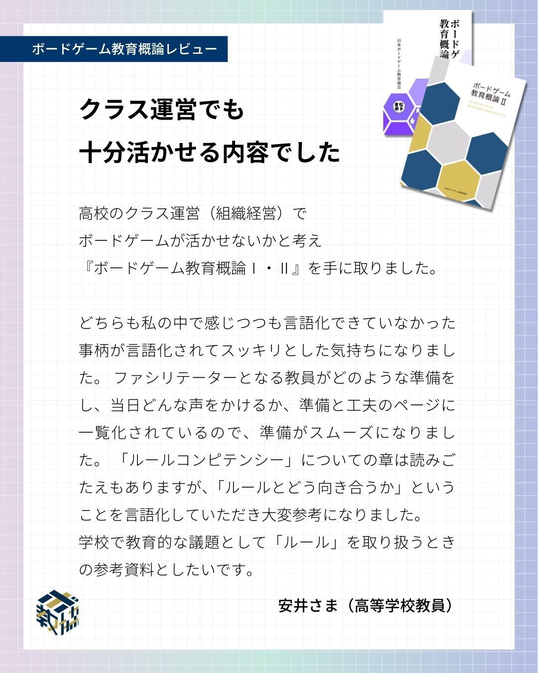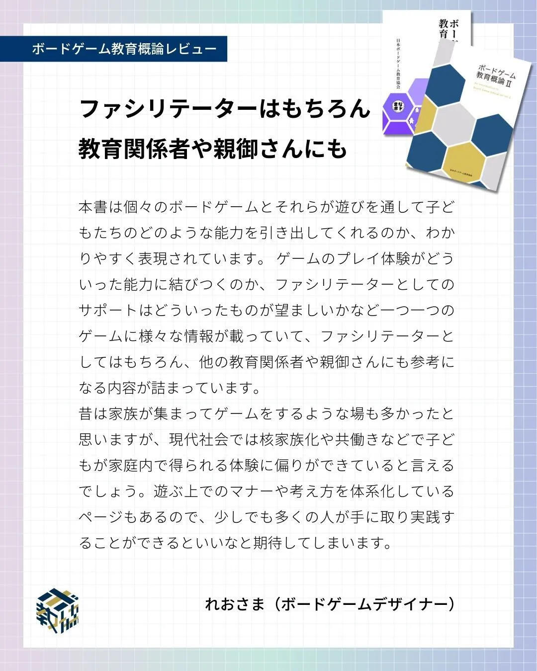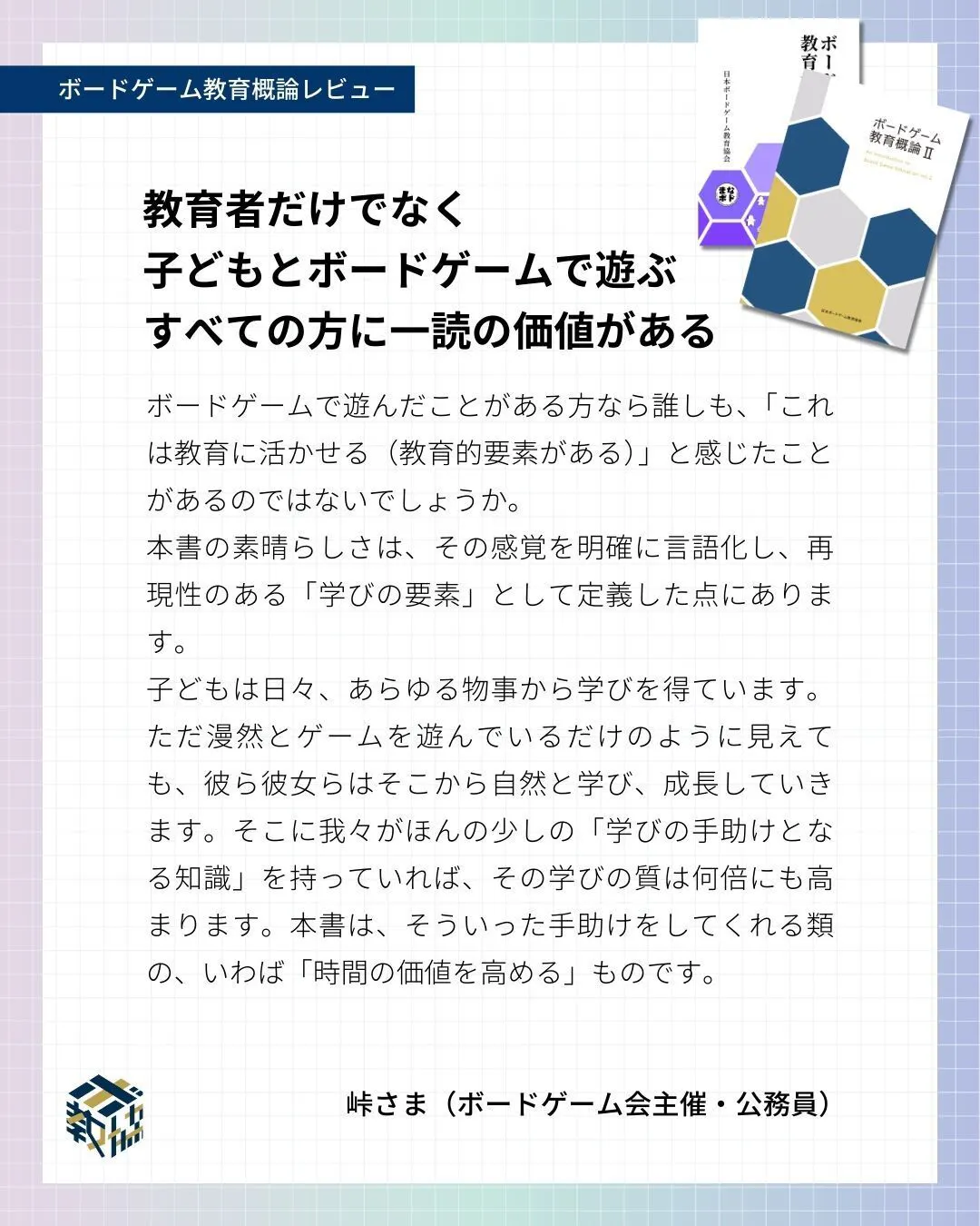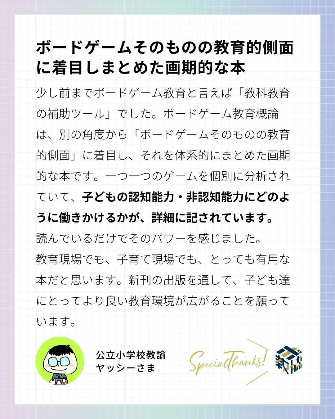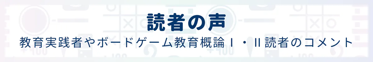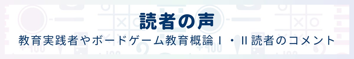 今回、新版 ボードゲーム教育概論の出版に当たり、過去に発刊した「ボードゲーム教育概論」Ⅰ・Ⅱ巻をご活用いただいている教育実践者の方や前作の読者様にレビューとコメントをいただきました。